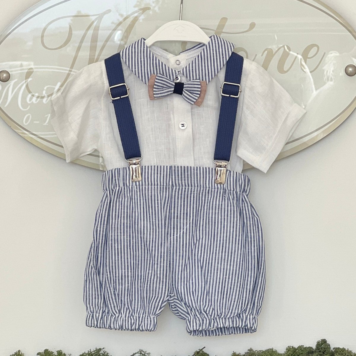 Completo elegante in lino composto da pantaloncini a righe con bretelle applicate e camicia in lino bianca a maniche risvoltabili. Un abito fresco e curato, ideale per cerimonie e occasioni speciali.