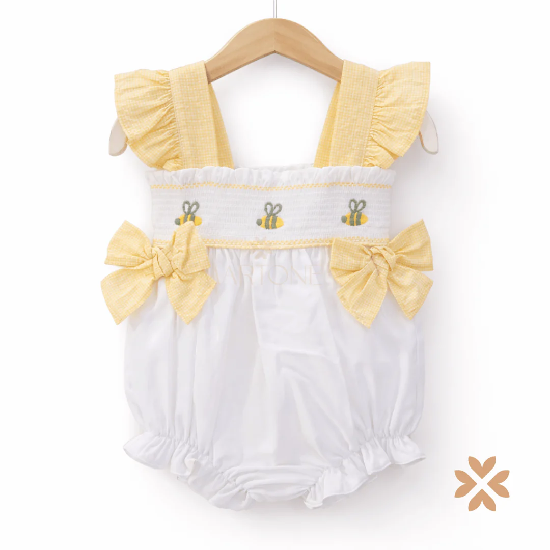 Pagliaccetto per neonata in cotone con corpino arricciato e ricamo smock decorativo. Spalline con volant e fiocchi laterali applicati. Parte inferiore arricciata per una vestibilità armoniosa e curata.