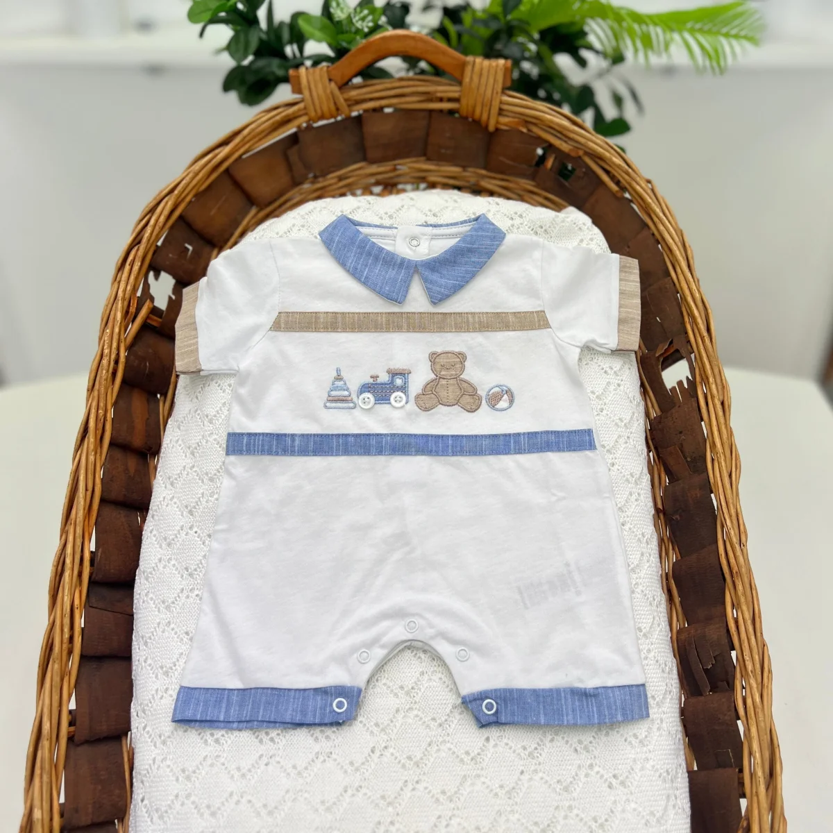 Pagliaccetto in cotone jersey, morbido e leggero, con ricami colorati. Un capo pratico e confortevole, ideale per accompagnare il neonato nelle sue giornate.