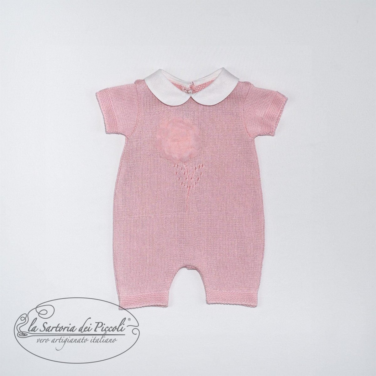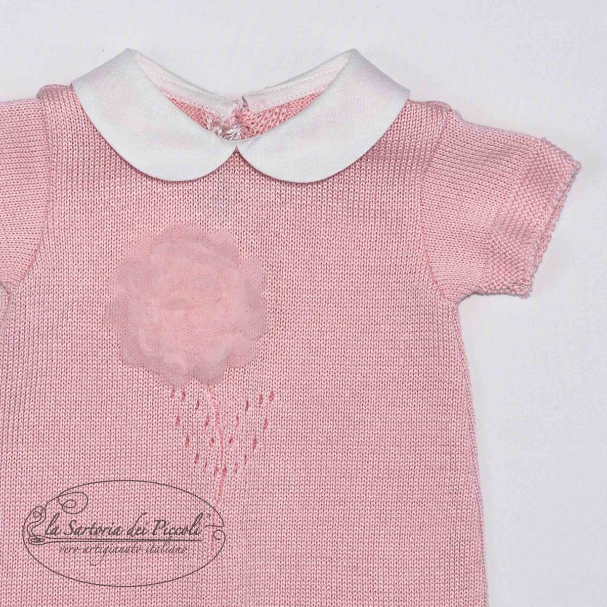 Pagliaccetto in filo di cotone rosa con colletto bianco, decorato con eleganti fiori tridimensionali. Un capo delicato e raffinato, perfetto per valorizzare con dolcezza le prime occasioni speciali.