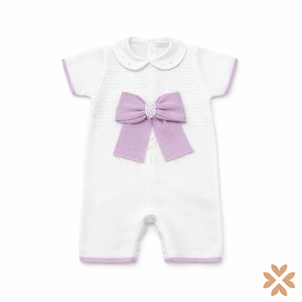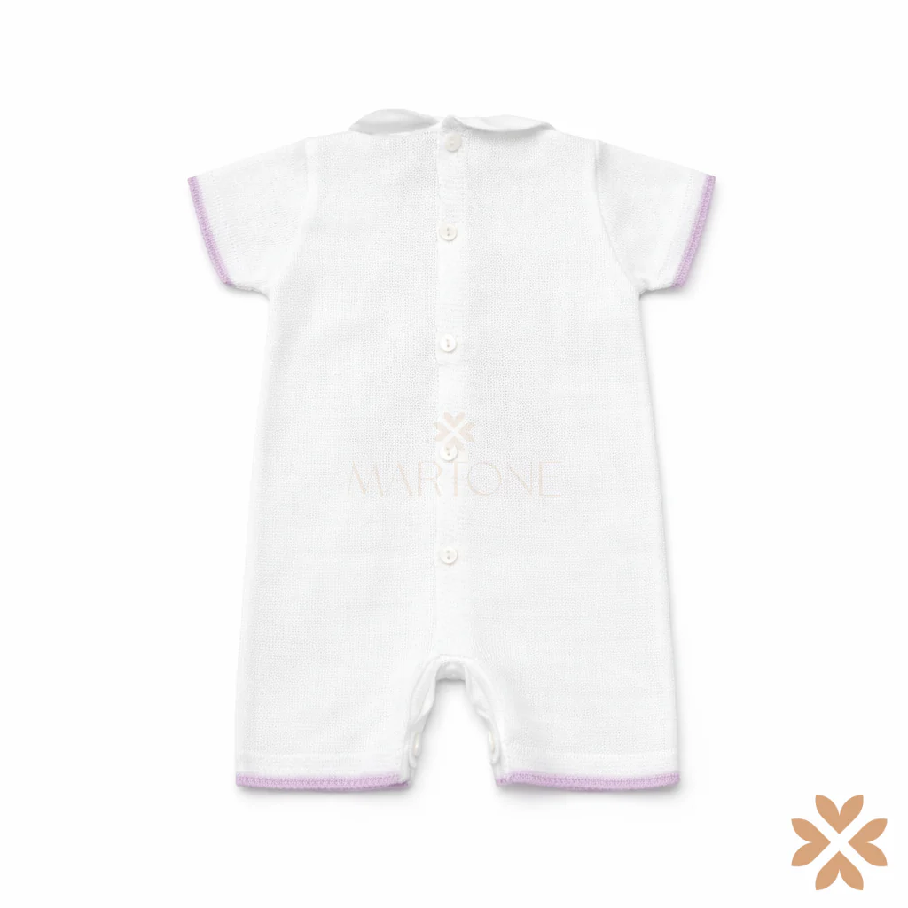 Pagliaccetto in filo a maglia con colletto classico e fiocco applicato sul fronte. Lavorazione decorativa sul petto. Chiusura posteriore con bottoni e apertura al cavallo con bottoni automatici. Manica corta. Ideale per corredino e occasioni speciali.