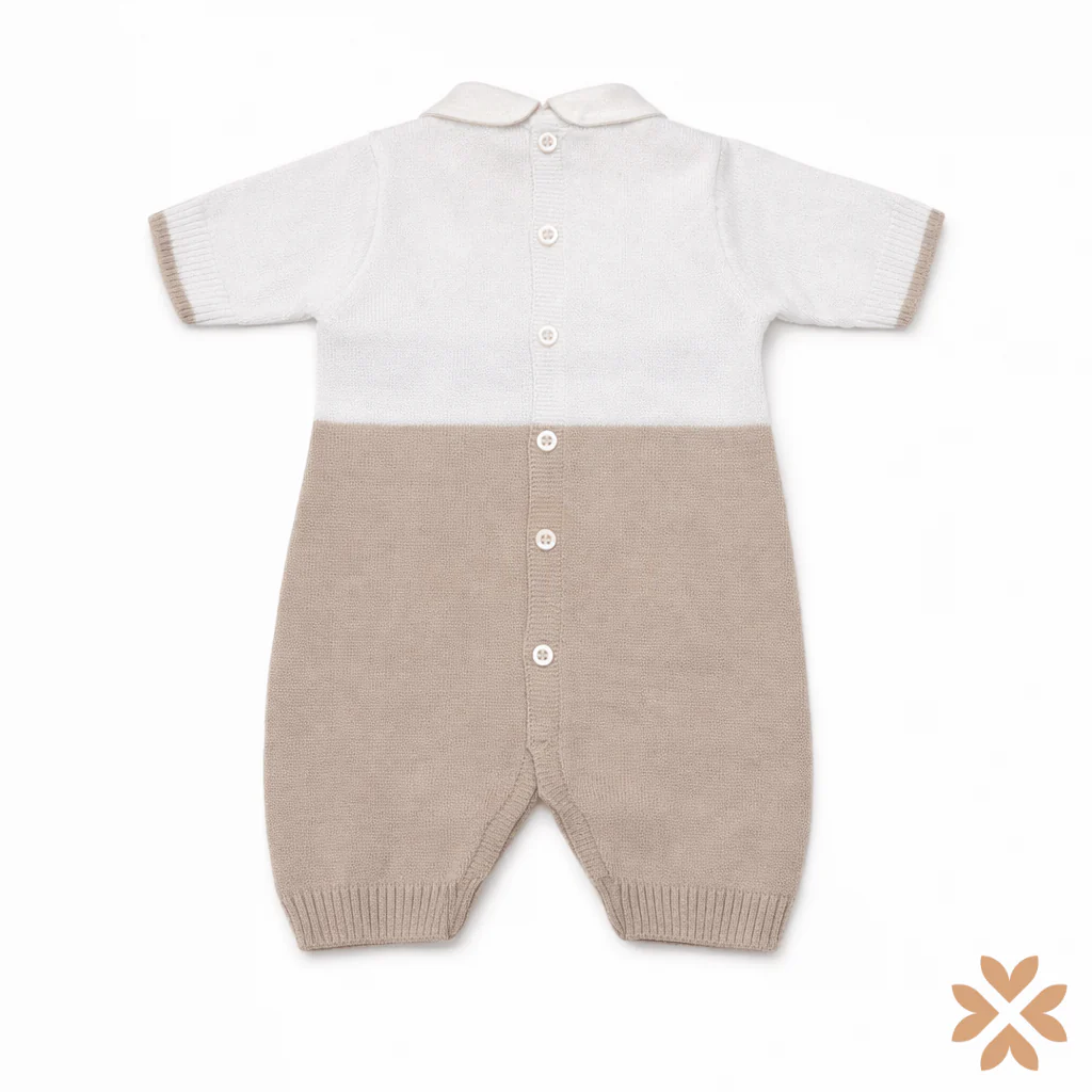 Pagliaccetto neonato in filo di cotone con colletto e motivo ondulato a contrasto sul davanti. Chiusura con bottoni sul fondo. Fondo a costine.