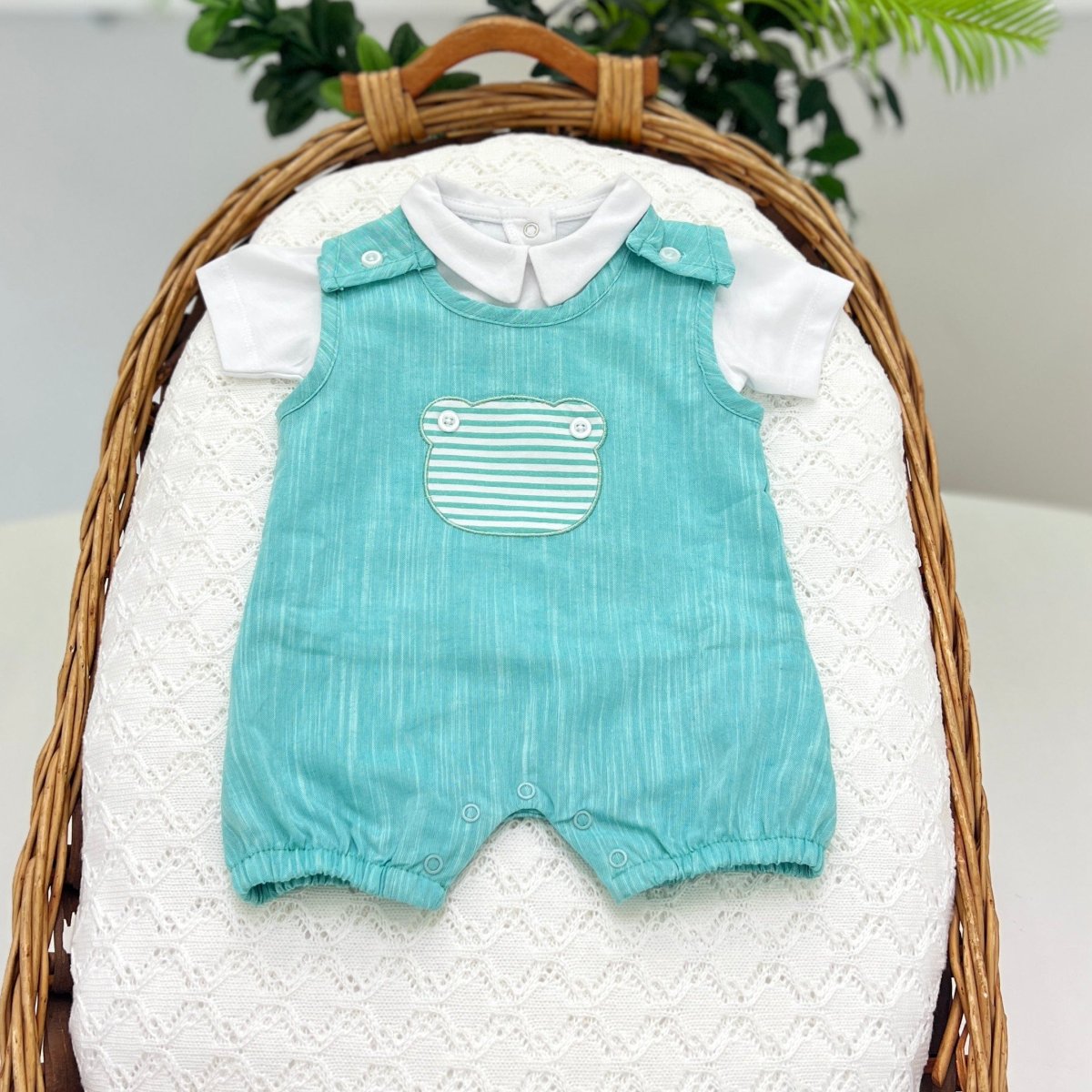 Pagliaccetto due pezzi con t-shirt in cotone jersey, morbido e pratico, perfetto per avvolgere il neonato con delicatezza in ogni momento della giornata.