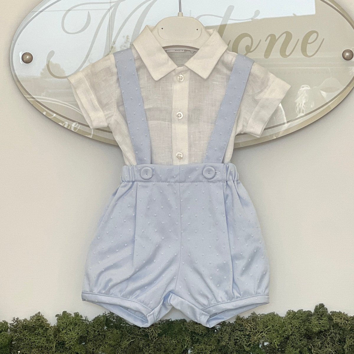 Completo composto da pantaloncino in plumetis con bretelle e camicia in lino mezza manica.