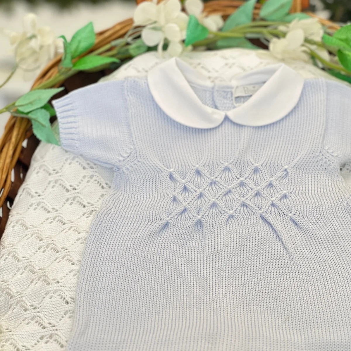 Pagliaccetto in filo di cotone celeste chiaro, lavorato a maglia con dettagli in punto smock e piccoli nodini. Colletto bianco a contrasto per un design raffinato e comodo per il neonato.