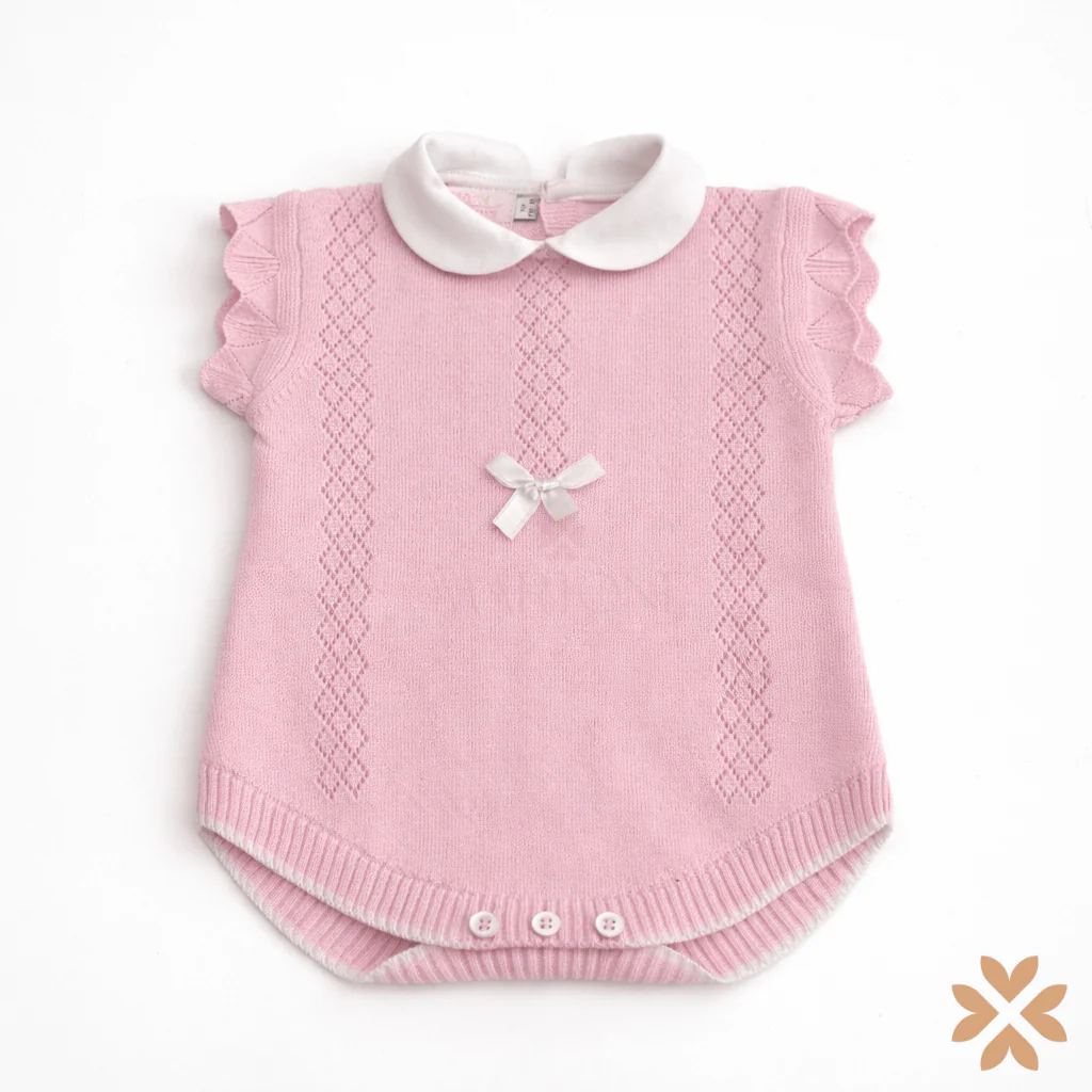 Pagliaccetto in filo di cotone con maniche a smerlo, colletto bianco. Chiusura con bottoncini