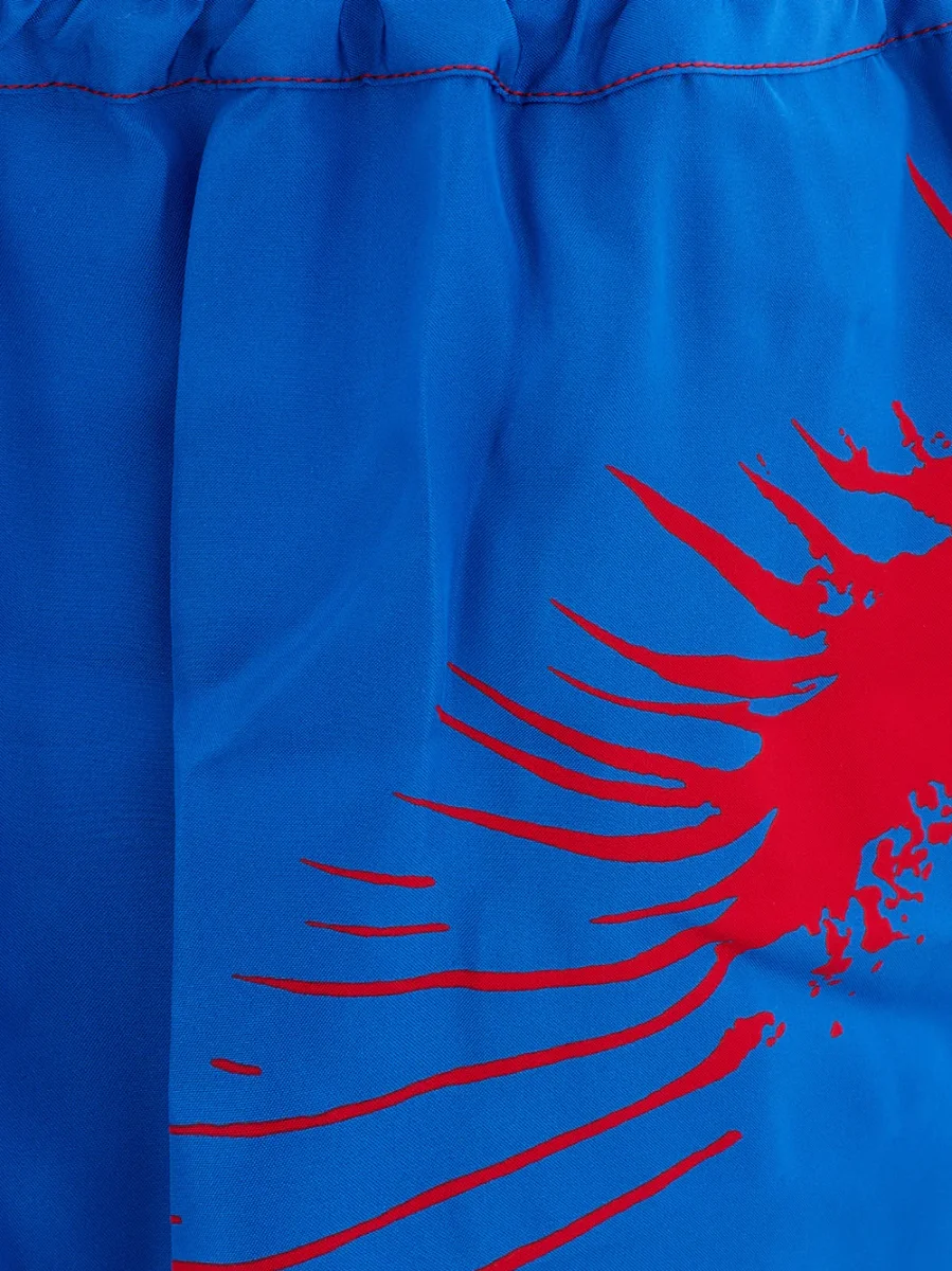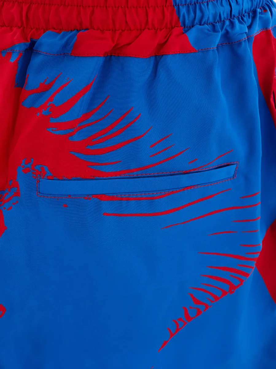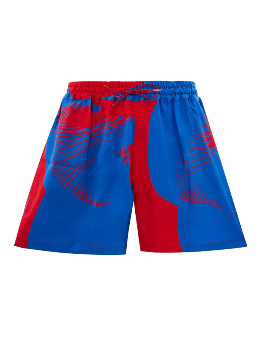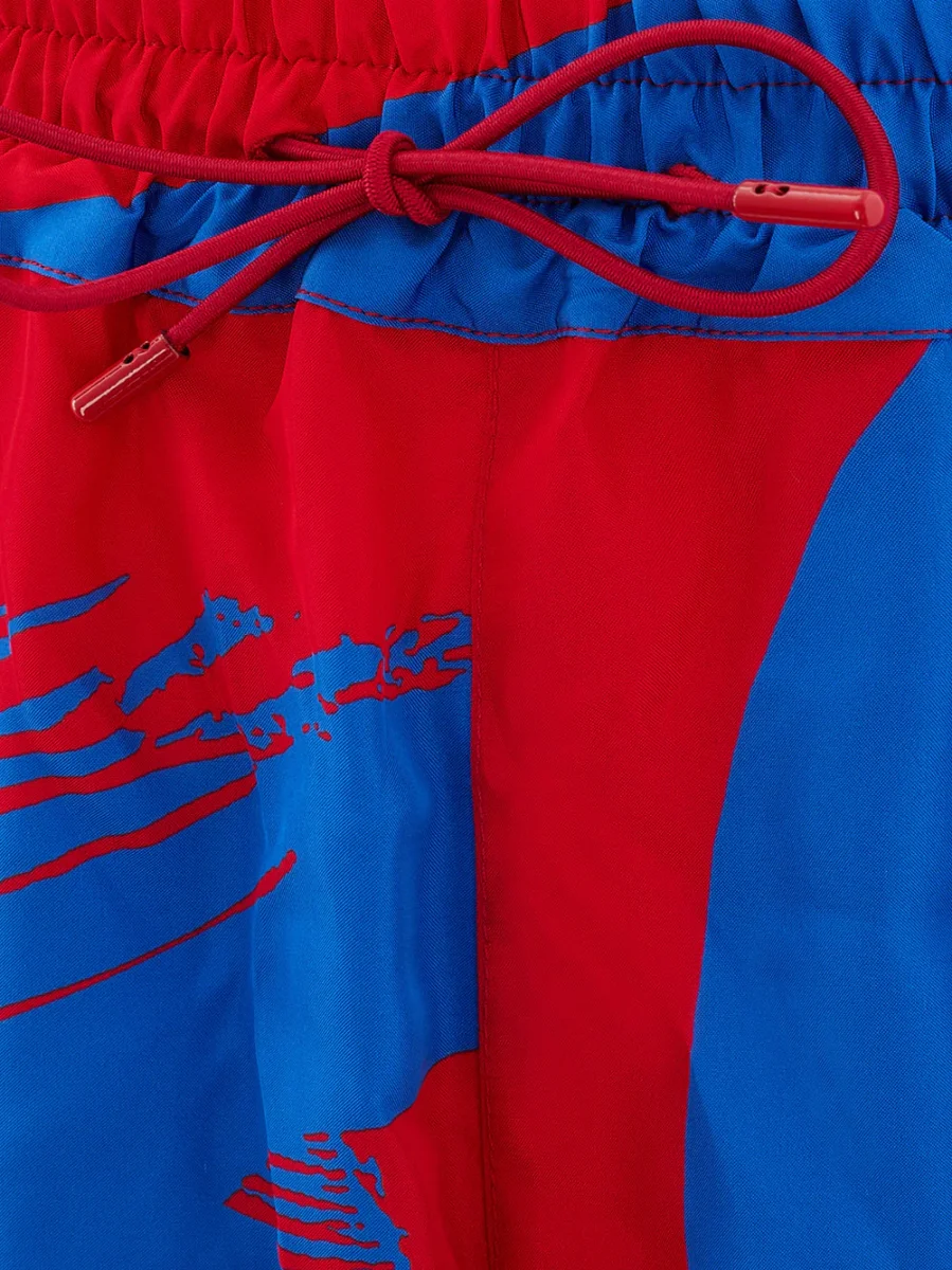 Pantaloncino Misto Seta Boxeur Bottega Veneta con stampa allover blu/rossa con due tasche laterali ed una posteriore a filetto, elastico in vita con coulisse. Sku Articolo: 667101. Composizione: 84% Viscosa, 16% Seta-Sku interno:23OT31
