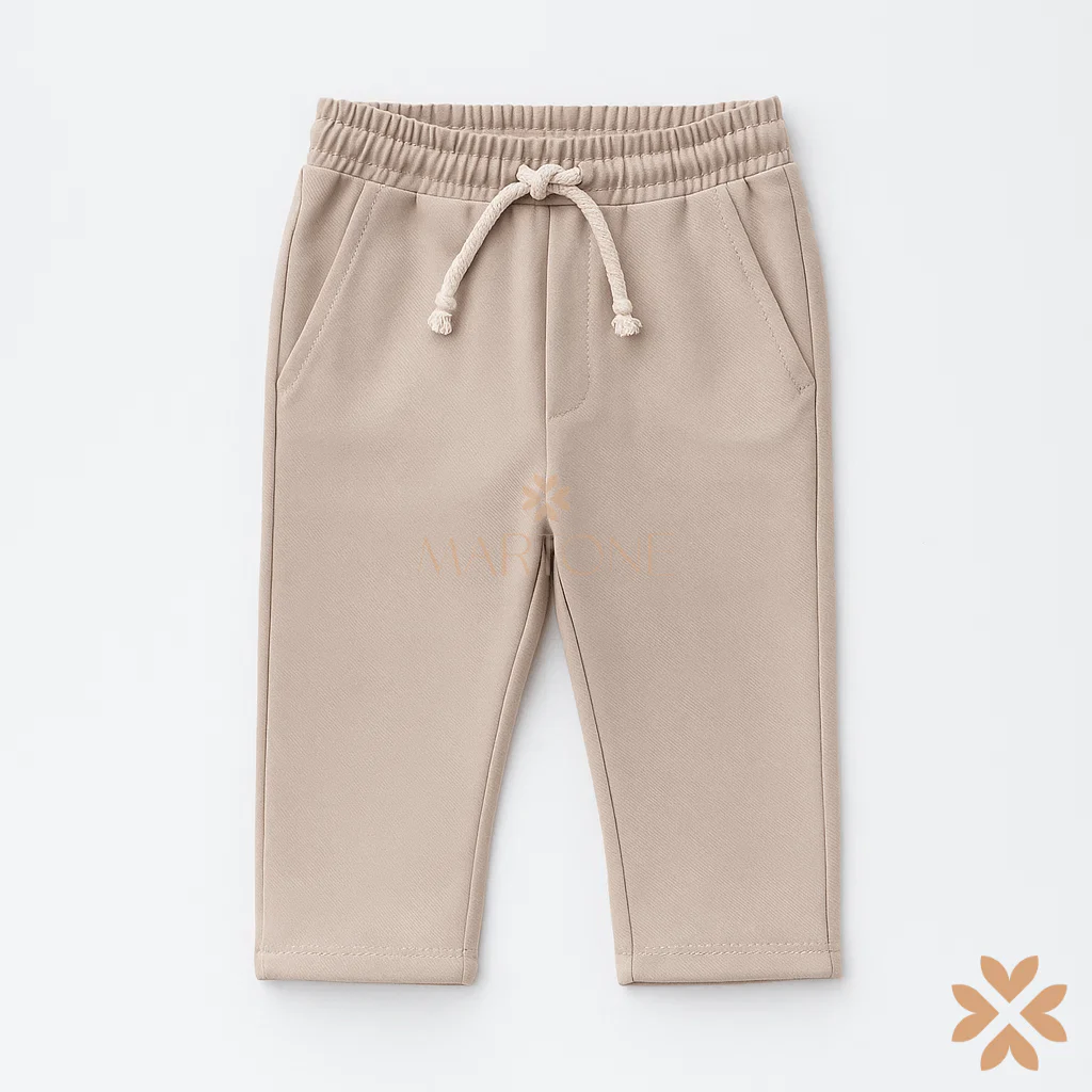 Pantalone per bimbo in flanella di cotone beige, con vita elastica regolabile tramite laccetto funzionale e linea comoda, ideale per un look pratico e versatile.