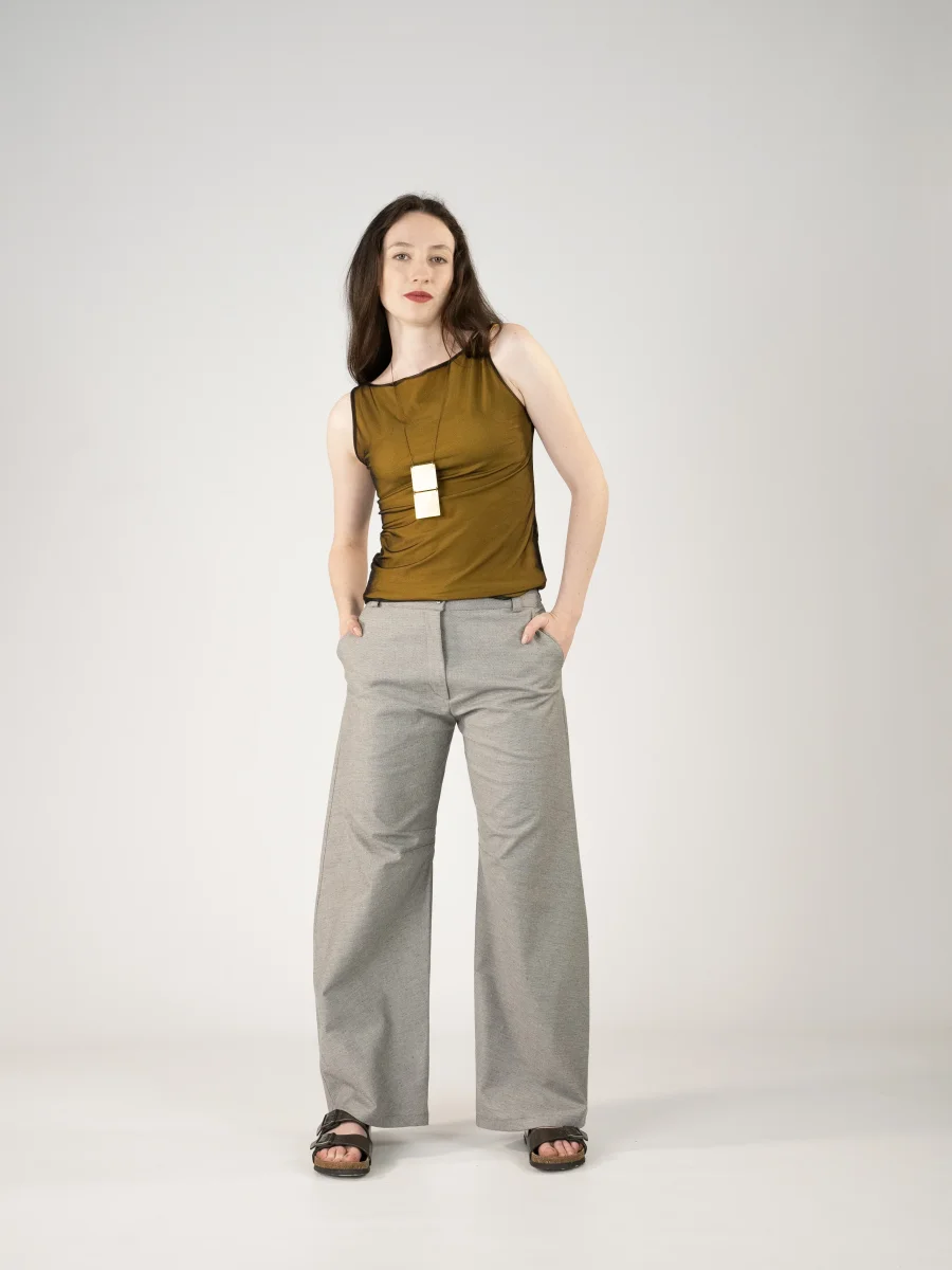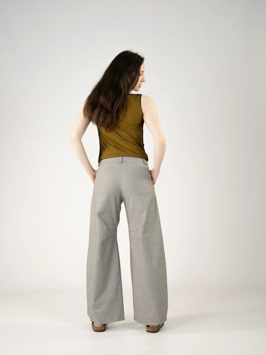 Pantalone largo con pences all’altezza delle ginocchia, tasche laterali e passanti.