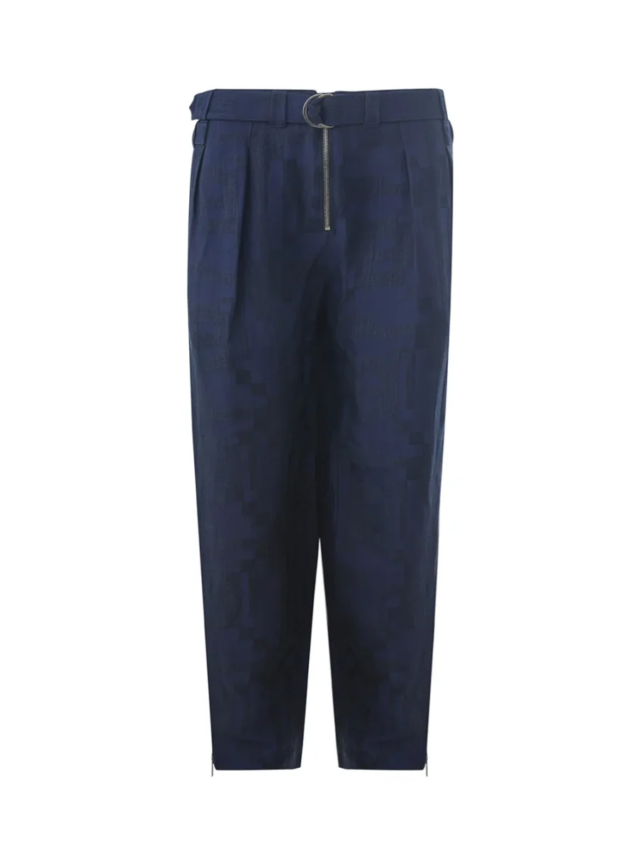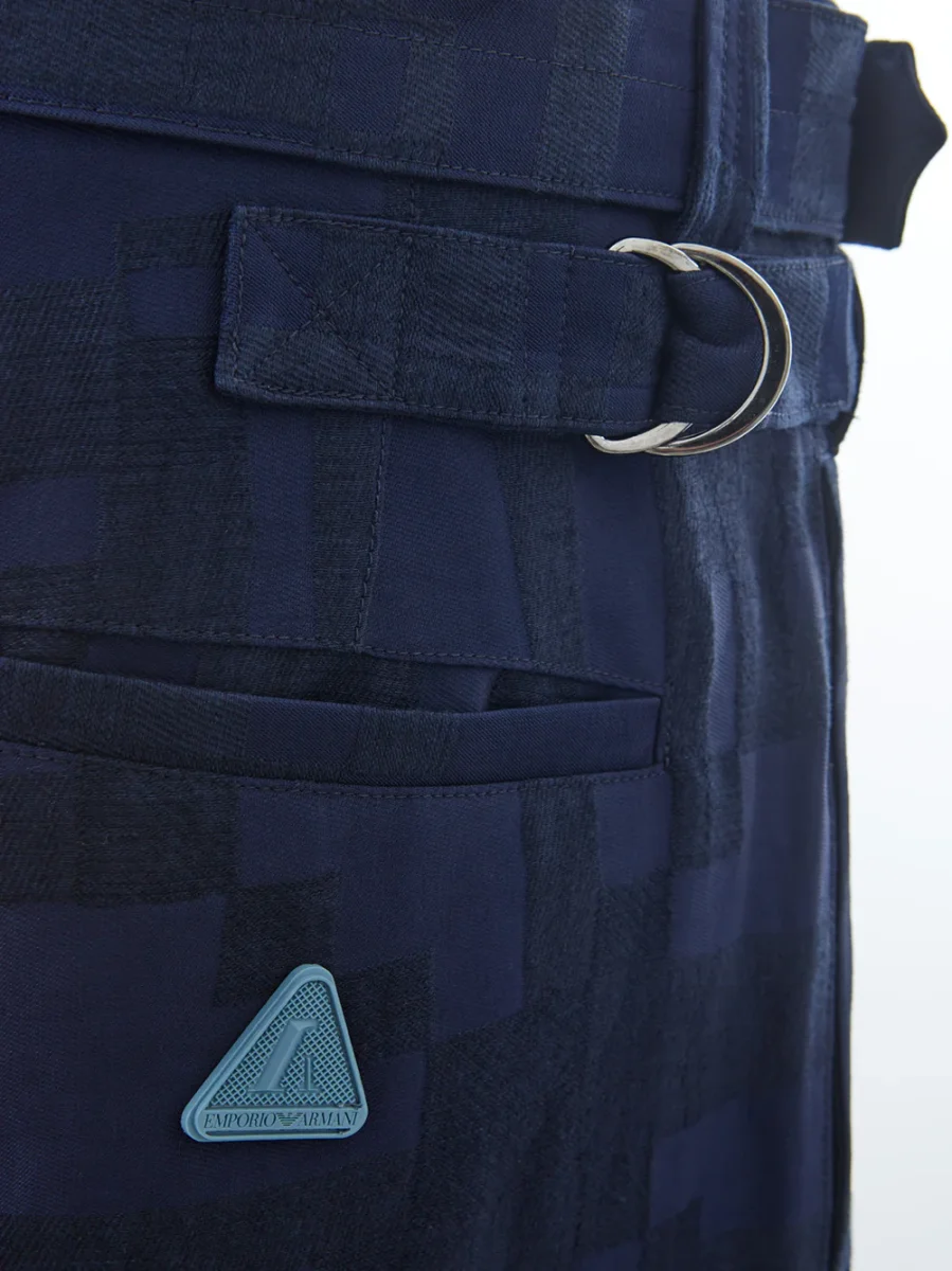 Pantalone con Cintura Relaxed Fit Emporio Armani, blu con stampa tono su tono all over con motivo geometrico, chiusura in vita con zip e cintura, due tasche laterali, due posteriori a filetto, logo applicato sul retro in gomma a contrasto, zip sul fondo. Composizione: 47% Lino, 45% Viscosa, 8% Poliammide-Sku interno:23MG154-157