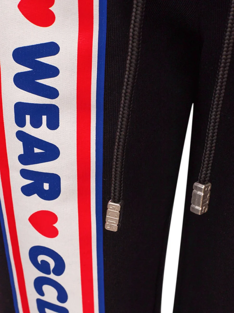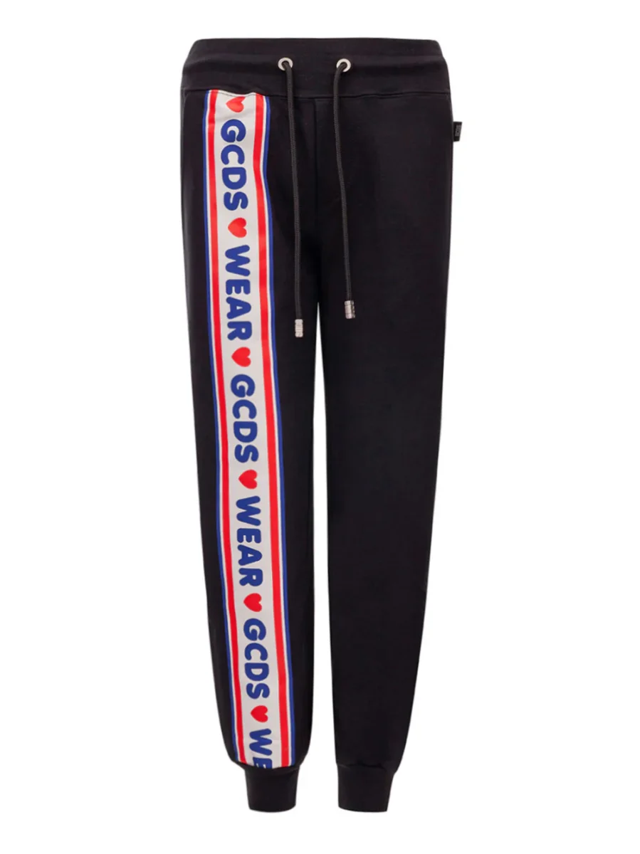 Pantalone Jogging nero con Logo GCDS, elastico in vita e coulisse regolabile, due tasche laterali ed una posteriore a filetto. Banda colorata gommata applicata sulla gamba con logo e stampa cuori. Polsini sul fondo in maglia. Il prodotto ha una vestibilità Extra Slim. Sku Articolo: CC94 W29S137. Composizione: 100% Cotone-Sku interno:23OT100