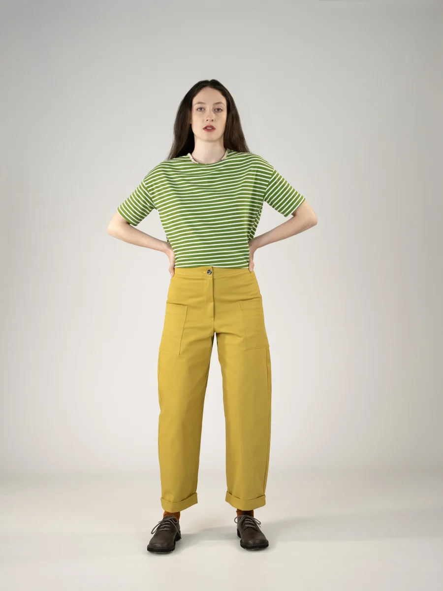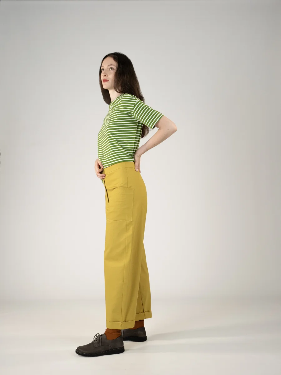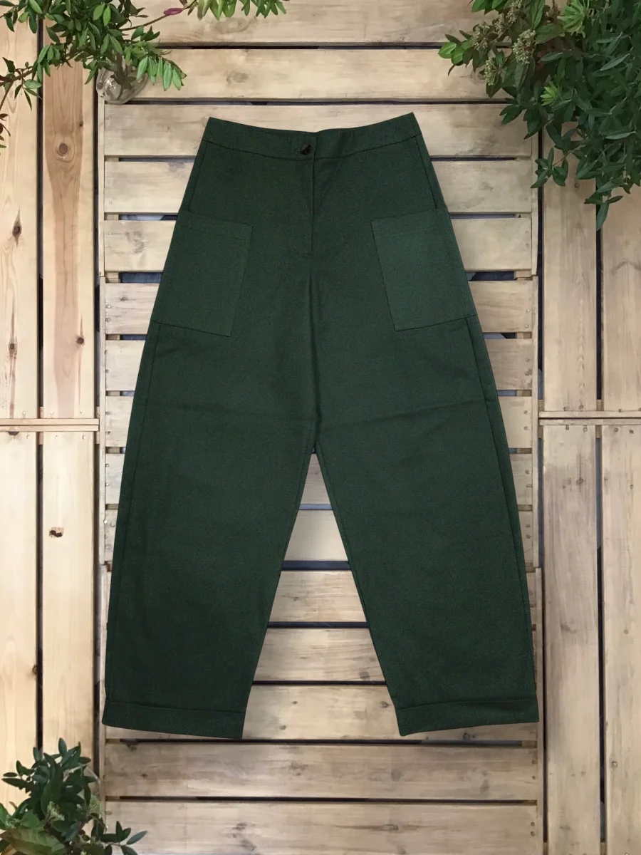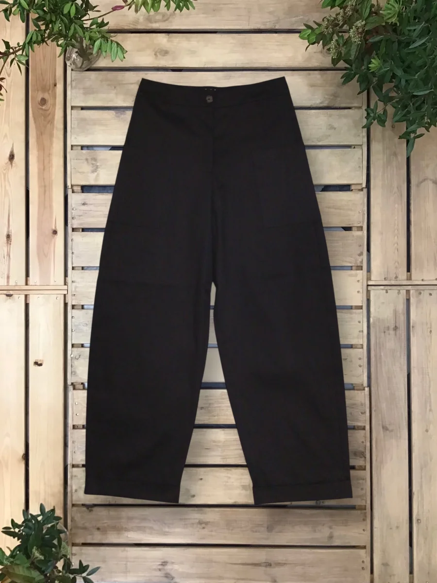 Pantalone ampio e stretto sul fondo, con piccolo risvolto. Tasche applicate.