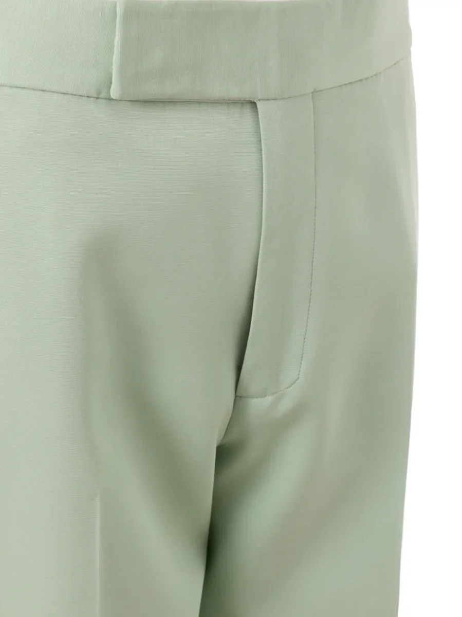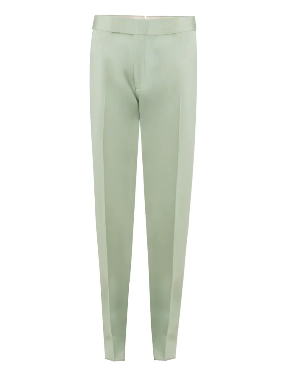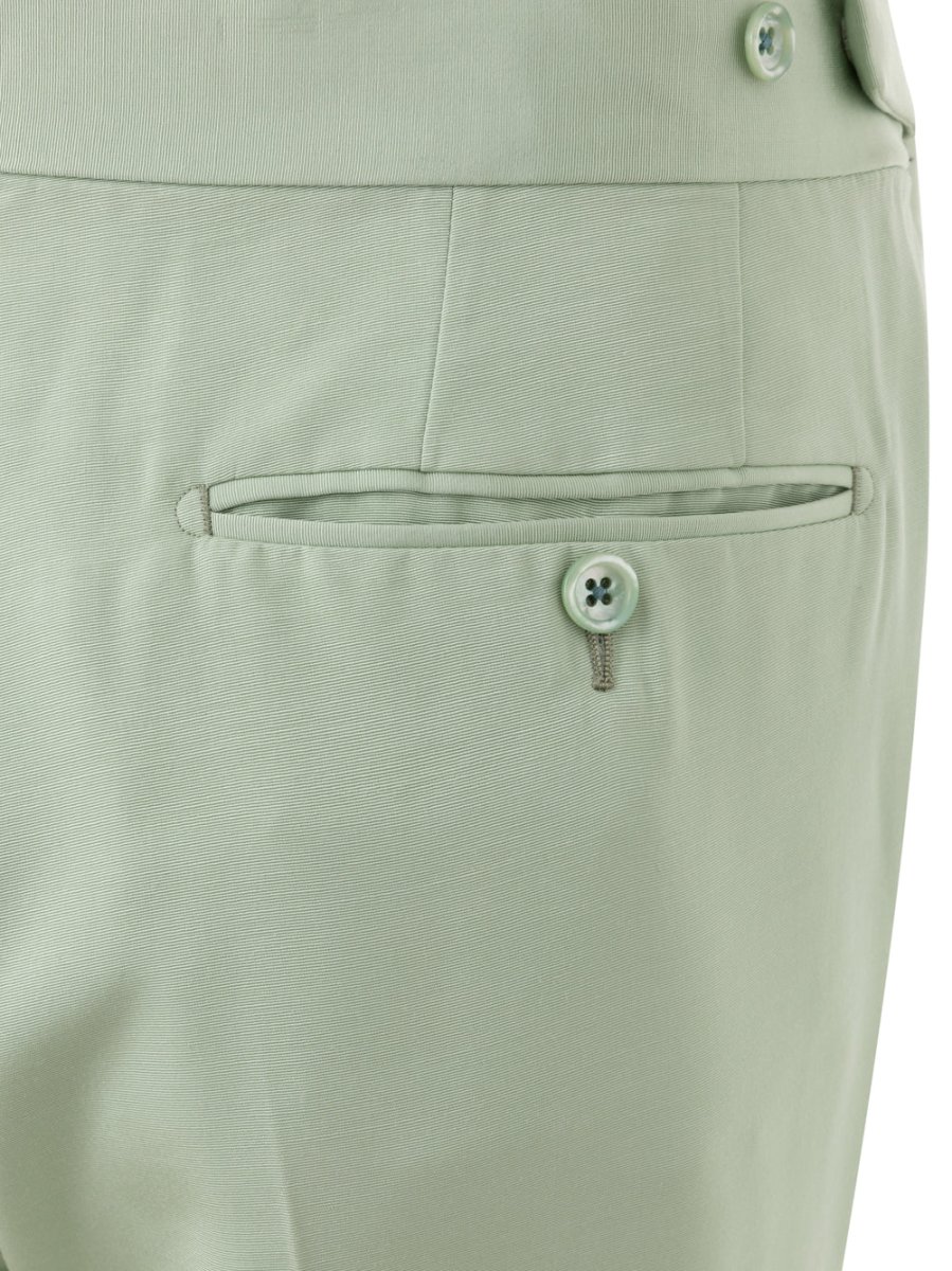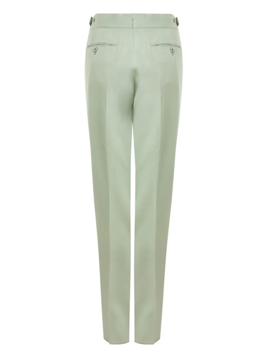 Pantaloni Eleganti Slim Tom Ford. In verde pistacchio, due tasche laterali a filetto e due tasche posteriori chiuse con bottoni, fascia in vita, chiusura con gancini coperti. Vestibilità slim, gamba stretta.