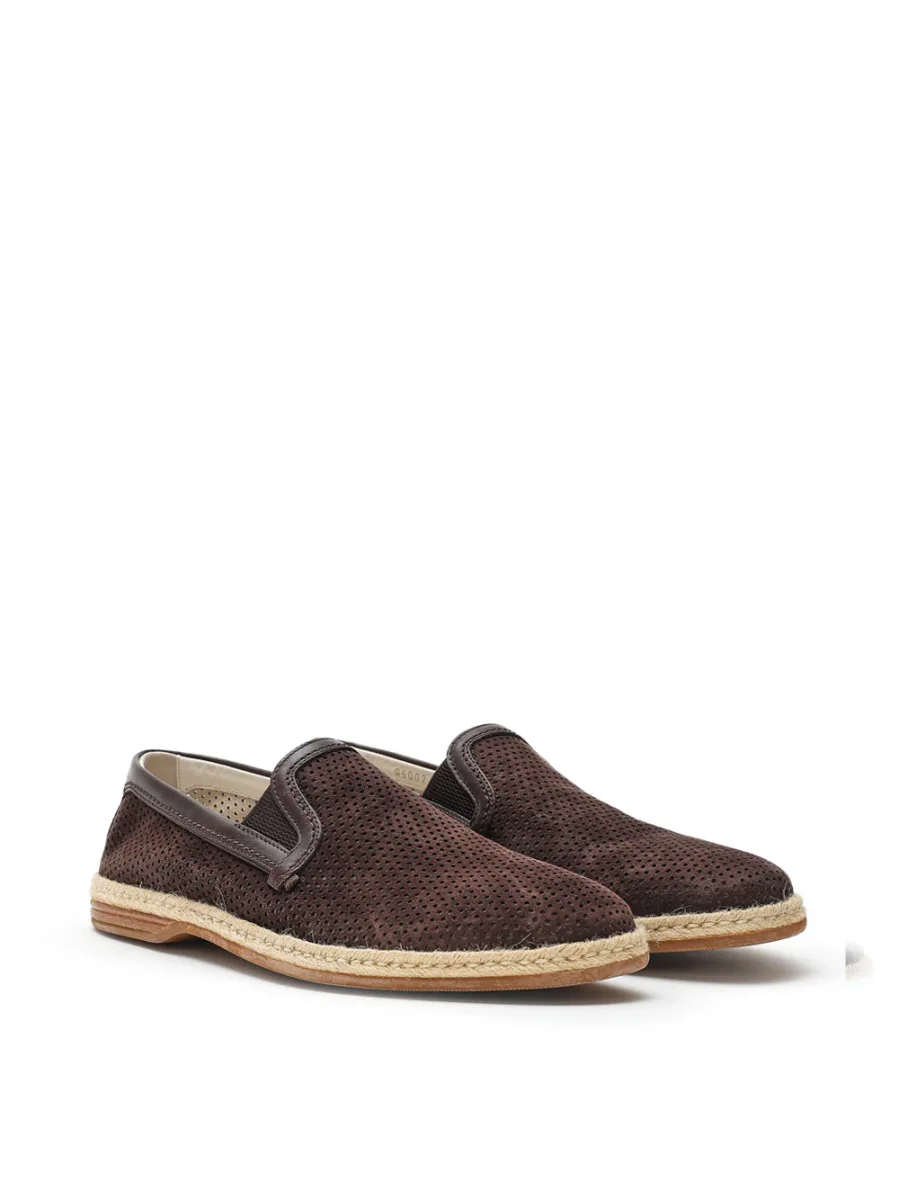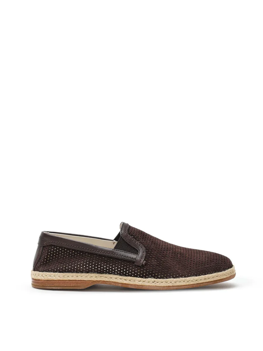 Pantofola in Suede Forata Marrone Dolce & Gabbana. Modello slip on, punta tonda, suola esterna in corda tipo espadrillas, bordo in pelle tono su tono e logo stampato sul retro.