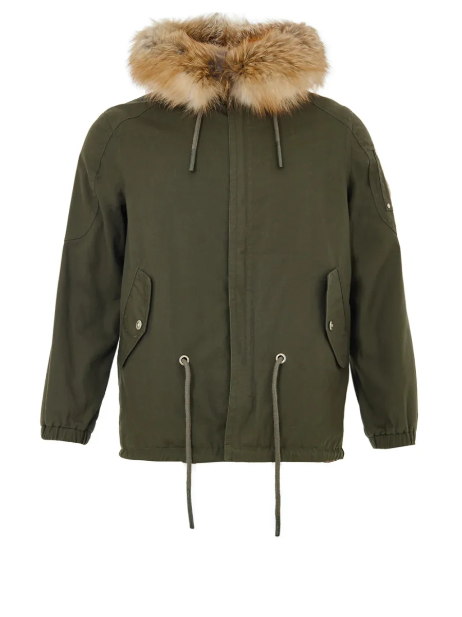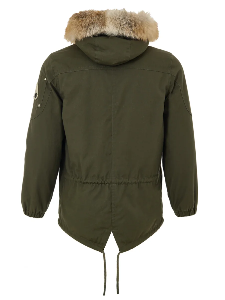 Parka Corto con Coulisse Verde Militare Moose Knuckles. Apertura frontale con zip coperta, coulisse interna in vita, due tasche laterali chiuse con patta e bottoni, elastico sul fondo e sui polsini. Cappuccio regolabile e removibile con inserto in pelliccia, sulla manica patch con logo metallico applicato.