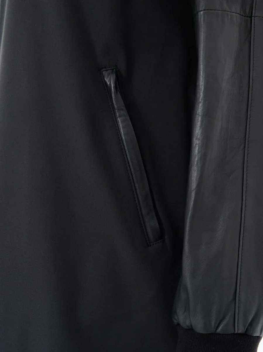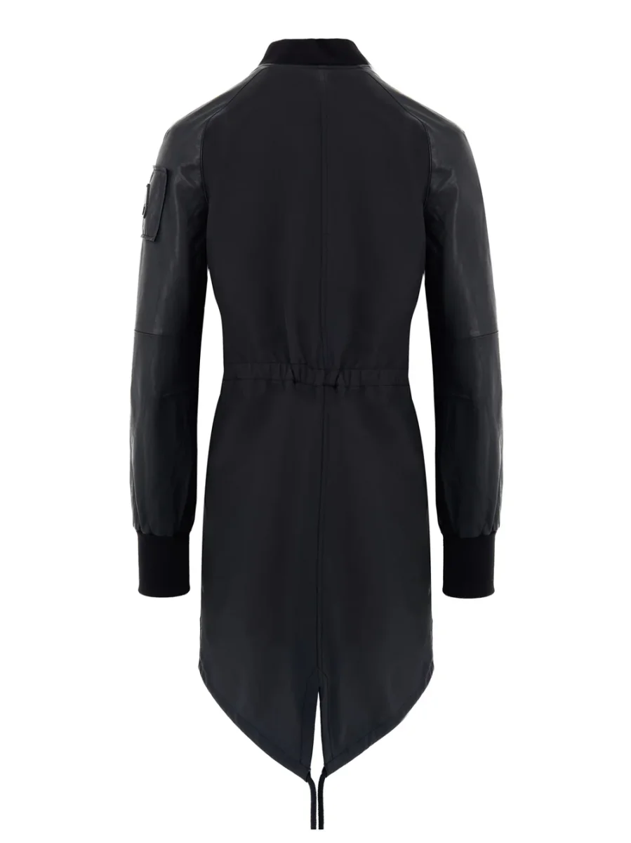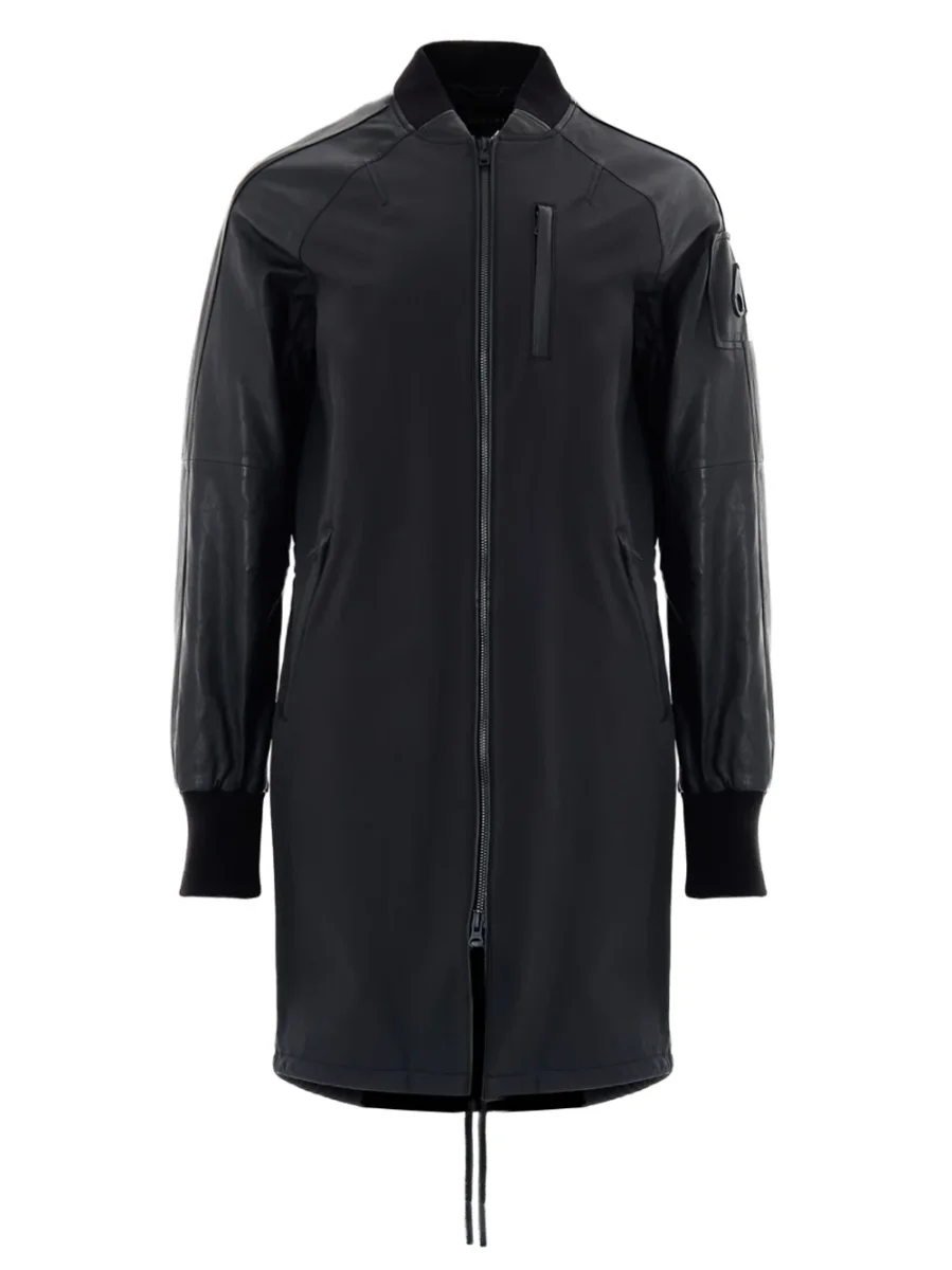 Parka Nero in Tessuto Tecnico e Pelle Moose Knuckles. Leggero e non imbottito, allacciatura frontale con zip, due tasche laterali chiuse con zip, taschino sul lato, maniche in pelle. Elastico in vita, linea asimmetrica più lungo sul retro.
