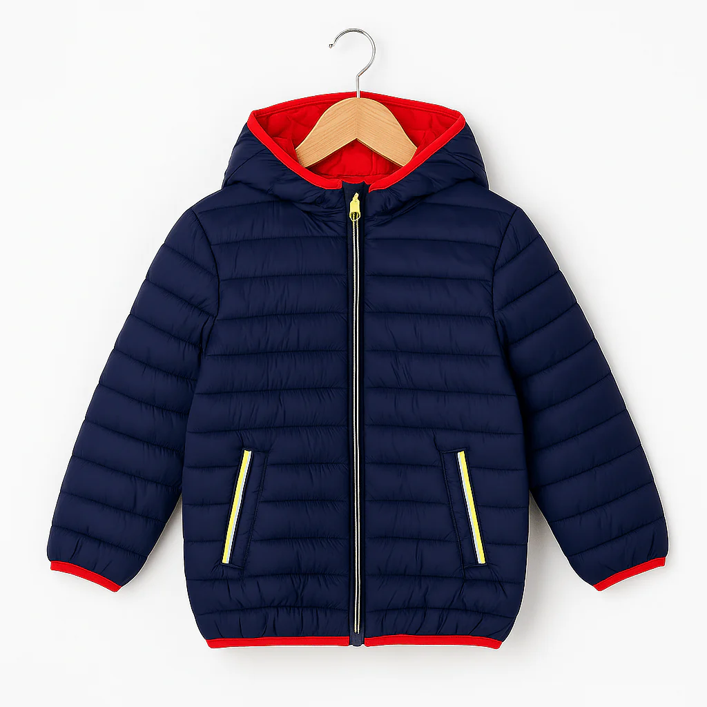 Piumino 100 grammi in colore blu, con interni a contrasto rossi e dettagli gialli sulle tasche. Dotato di cappuccio, zip frontale e finiture elasticizzate. Un modello leggero e funzionale, ideale per l’uso quotidiano.