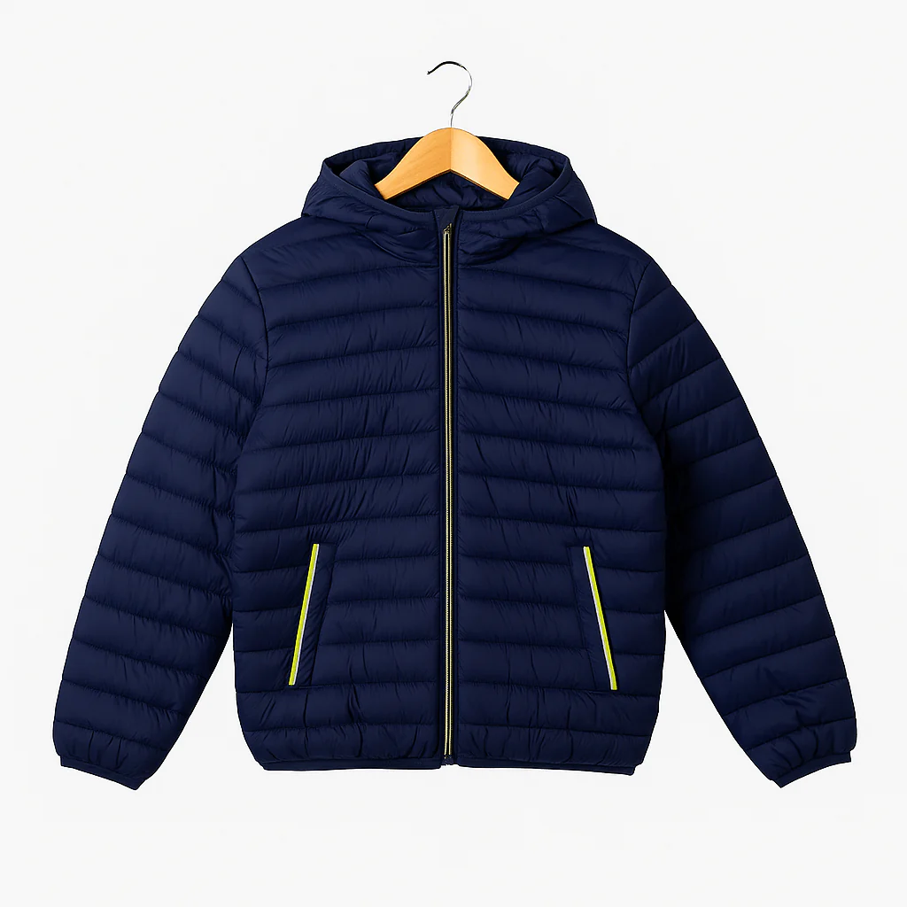 Piumino 100 grammi in colore blu, con cuciture orizzontali e dettagli a contrasto giallo sulle tasche. Dotato di cappuccio, zip frontale e finiture elasticizzate. Un modello leggero, pratico e ideale per l’uso quotidiano.