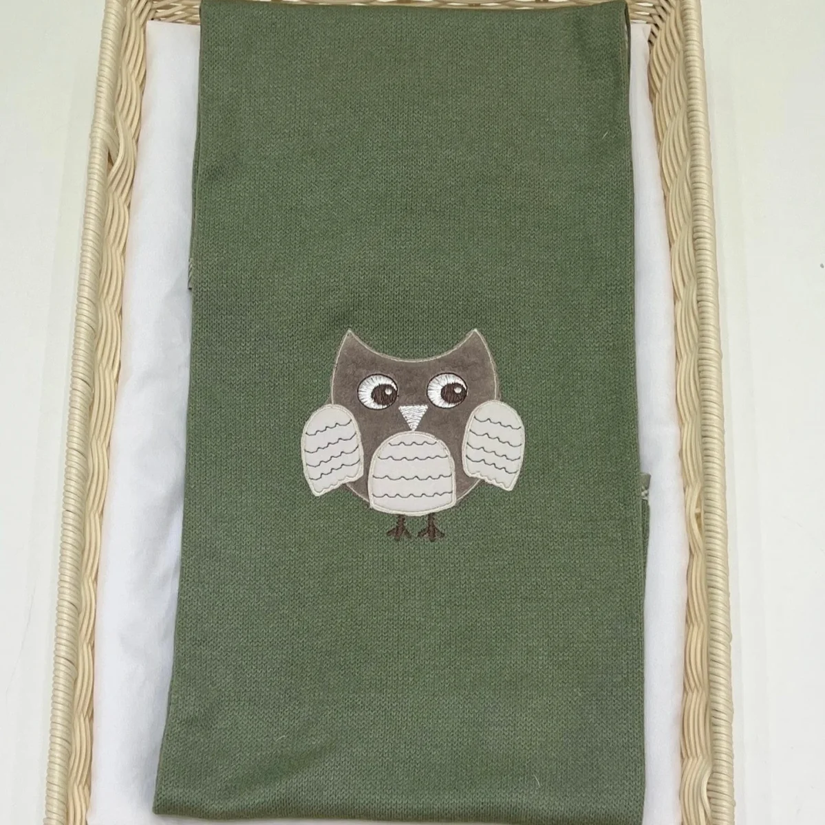 Un tenero plaid perneonato in maglina verde, arricchito da bordi blu che aggiungono un contrasto vivace e allegro. Al centro, un dolce gufetto ricamato cattura l’attenzione con il suo design simpatico e dettagliato, rendendo il plaid non solo pratico, ma anche un delizioso complemento per il lettino del piccolo.