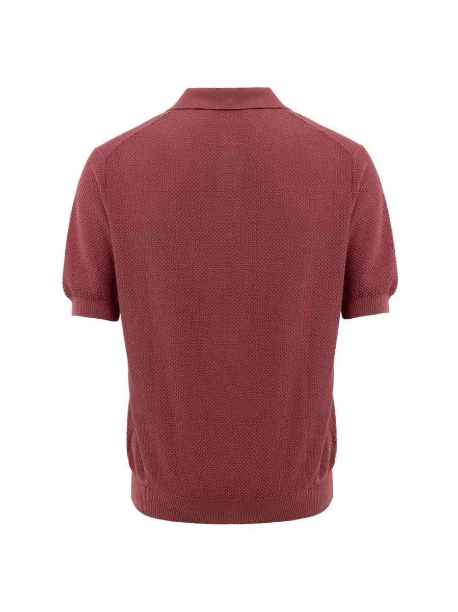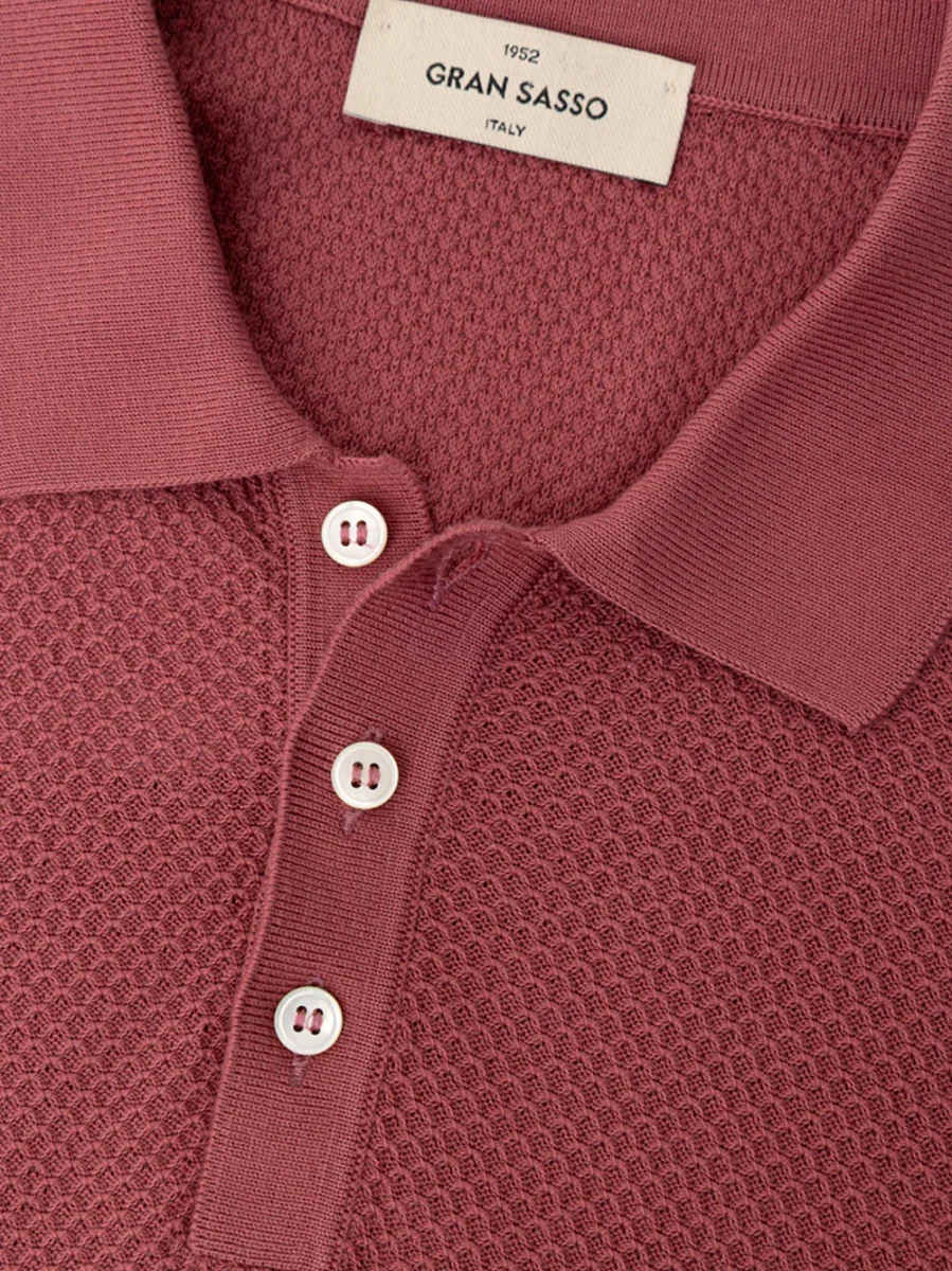 Polo con Trama Nido d’ape Gran Sasso. In cotone, colletto classico, chiusura con tre bottoni, fascia elasticizzata sul fondo. Tessuto con trama micro intreccio