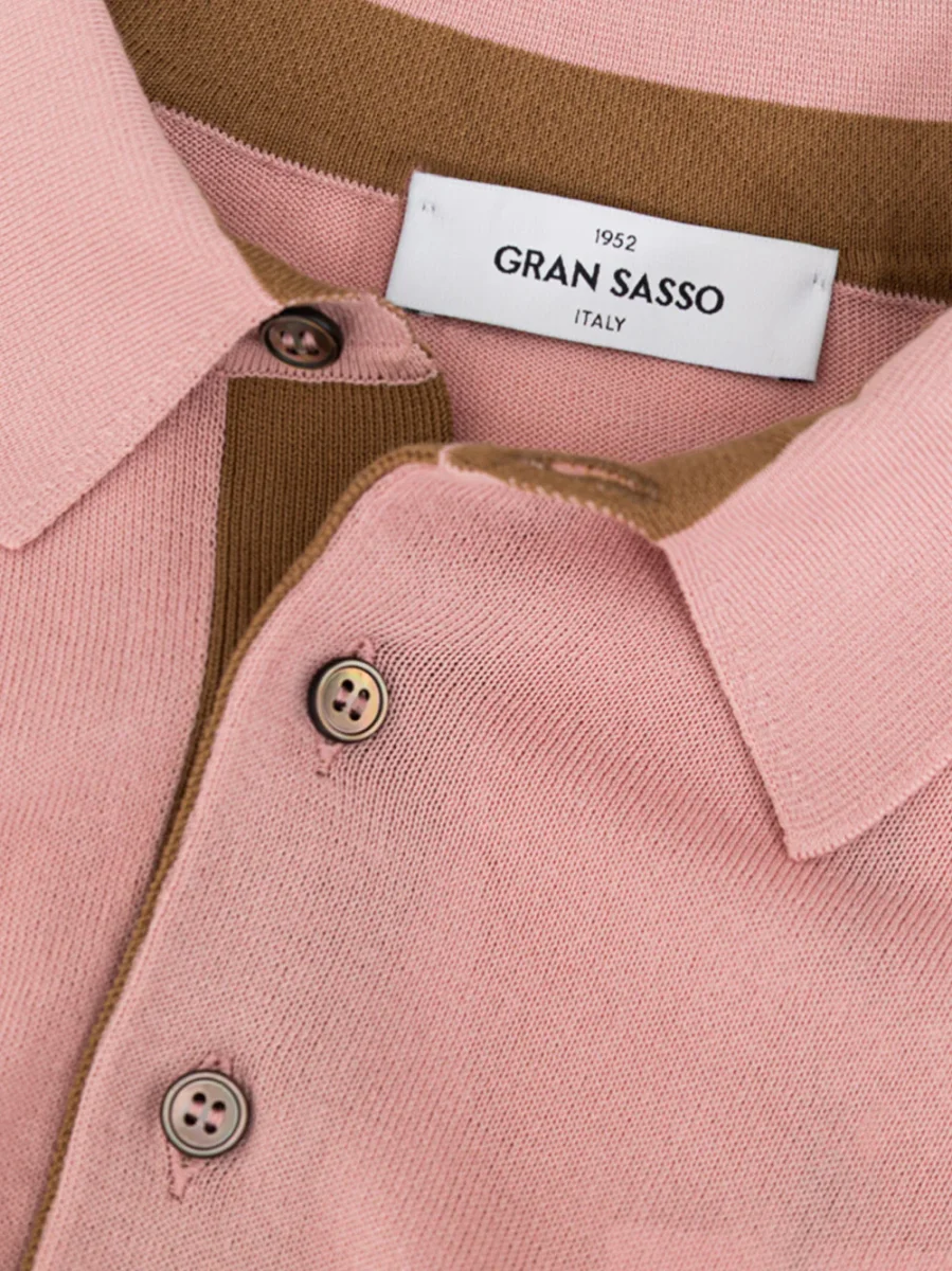 Polo Knitting Pattern in Rosa Gran Sasso. In cotone rosa con dettaglio marrone sul colletto e sul fondo, colletto classico, chiusura con tre bottoni