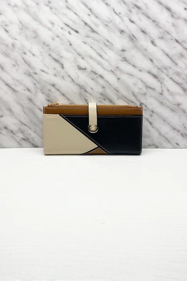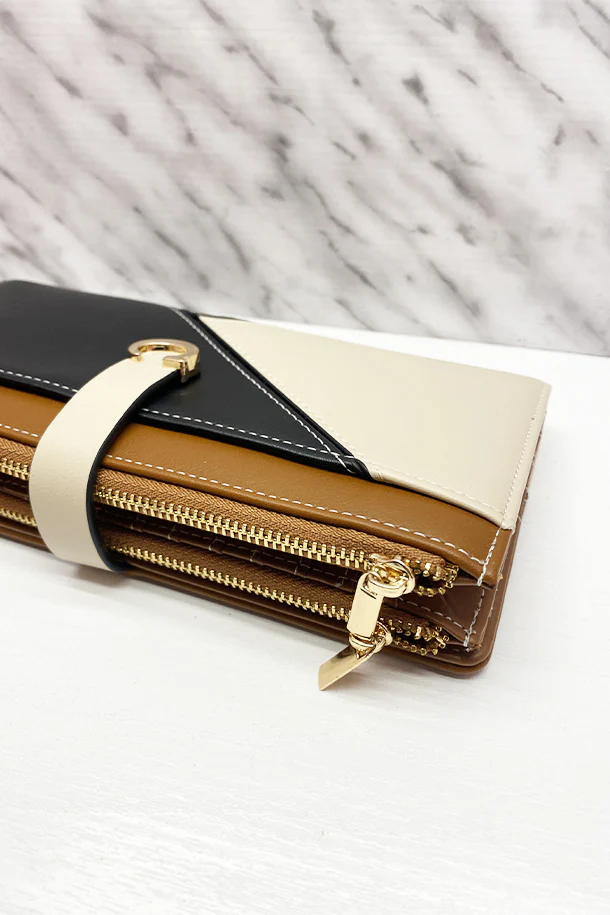 Portafogli a libro in eco pelle multi colore, laccio con bottone a chiusura, doppia zip, multi scomparti interni