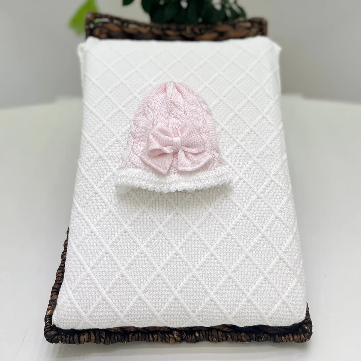 Cappellino per neonata in filo di cotone, con raffinata lavorazione intrecciata e fiocco applicato. Un accessorio delicato e sofisticato, ideale per aggiungere un tocco di eleganza al primo guardaroba.
