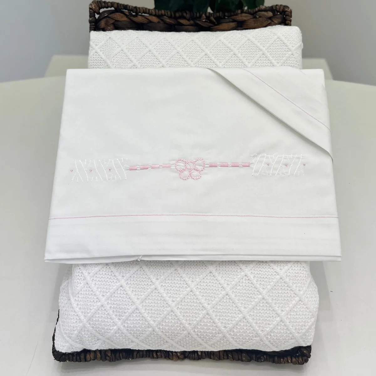 Set lenzuola in cotone, composto da sopra, sotto con angoli e federa. Impreziosito da una accurata lavorazione ricamata con fiocco centrale, aggiunge un tocco di dolcezza alla culla o al lettino. Morbido e raffinato, perfetto per accogliere il neonato con comfort ed eleganza.
