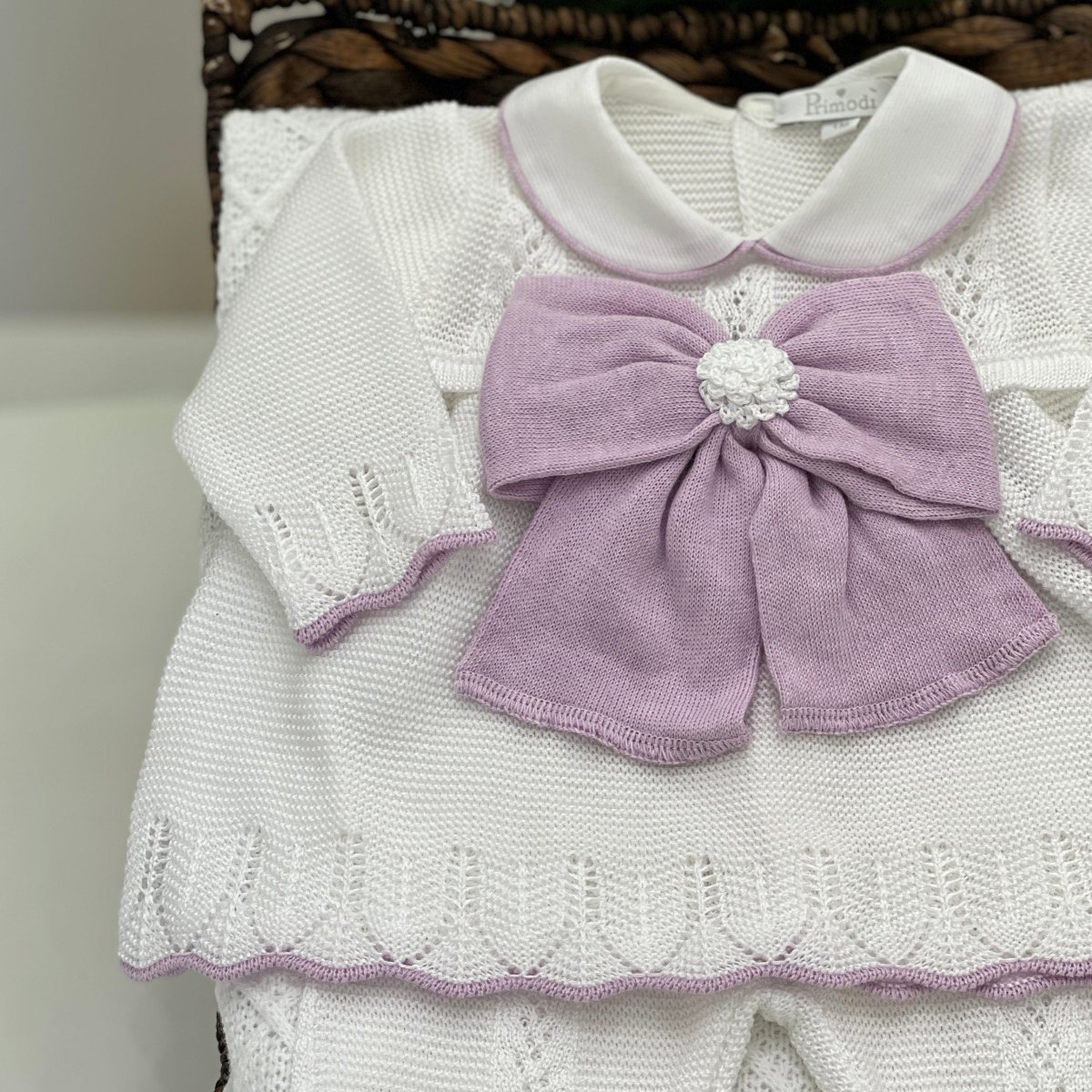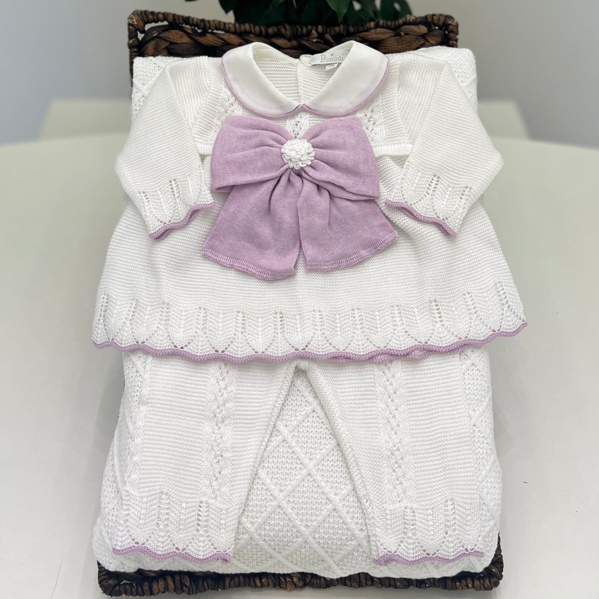 Tutina spezzata in cotone di alta qualità, con lavorazione traforata che dona leggerezza e traspirabilità. I bordini lilla rifiniscono il capo con grazia, mentre il fiocco al centro aggiunge un dettaglio tenero e sofisticato. Perfetta per ogni occasione speciale.