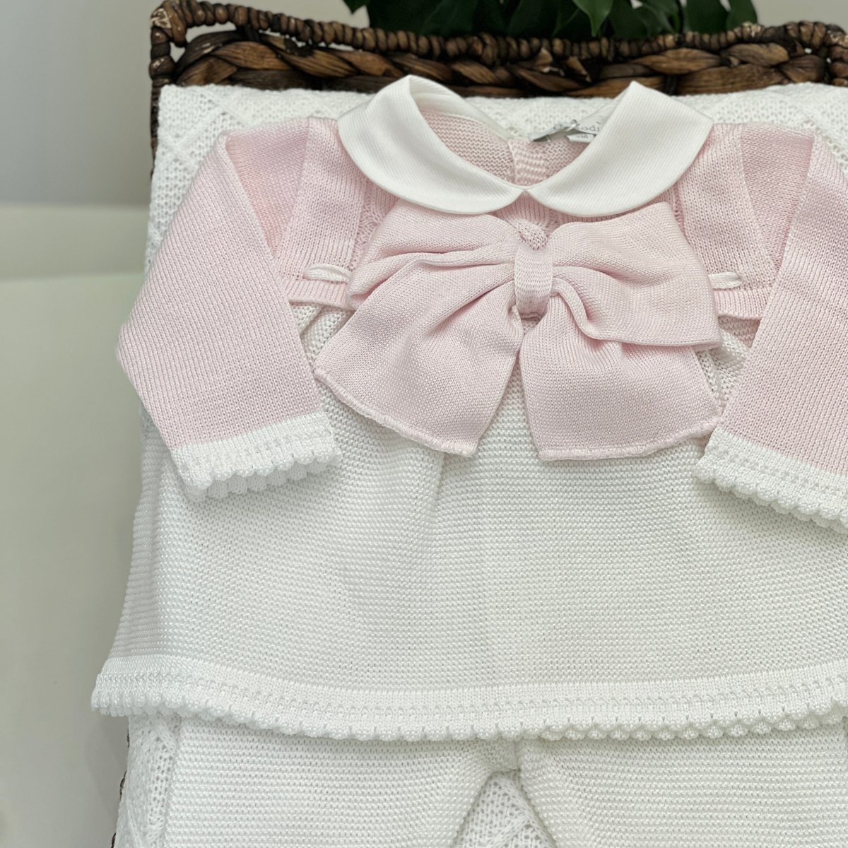 Tutina spezzata per neonata nei delicati contrasti di rosa e bianco, realizzata in filo di cotone con una raffinata lavorazione intrecciata. Il colletto in piquet di cotone aggiunge un tocco classico, mentre i dettagli con passanastri esaltano l’eleganza del capo. Al centro, un fiocco delicato completa il design con un dettaglio sofisticato. Un capo prezioso, perfetto per le prime occasioni speciali.