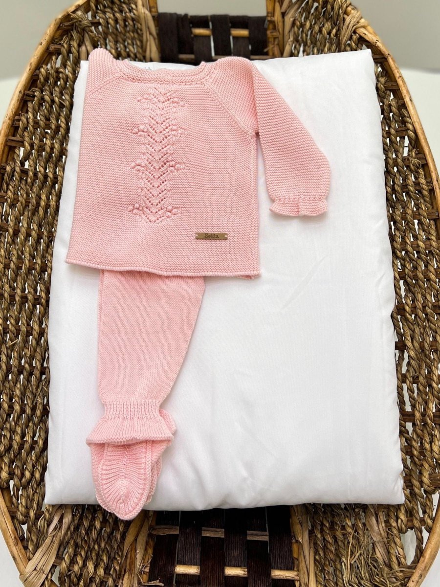 Completo clinico neonata due pezzi in filo di cotone composto da maglia a manica lunga con trama traforata e ghettine con rouches.