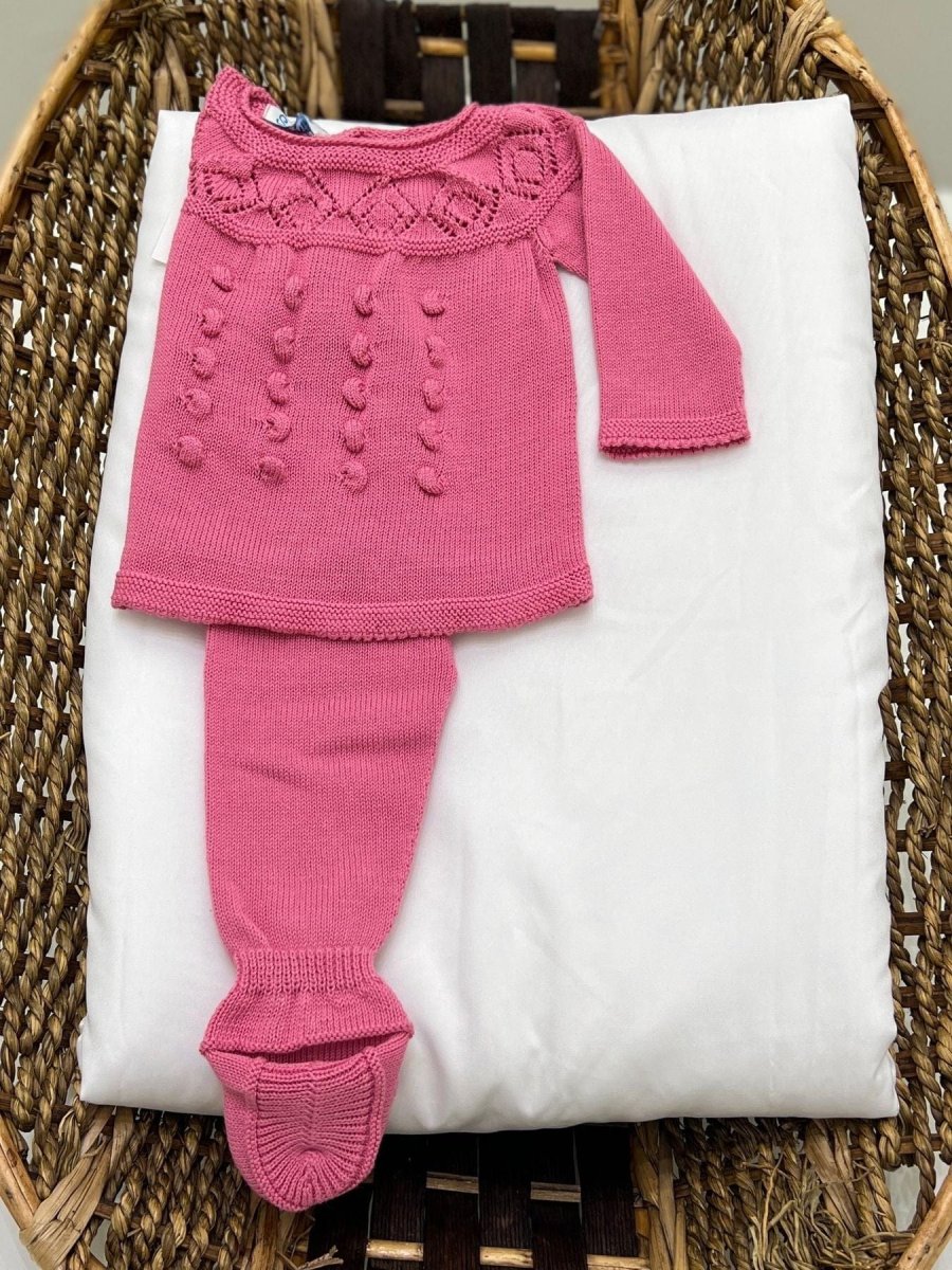 Completo clinico neonata due pezzi in filo di cotone, composto da maglia con trama traforata a manica lunga e ghettine.