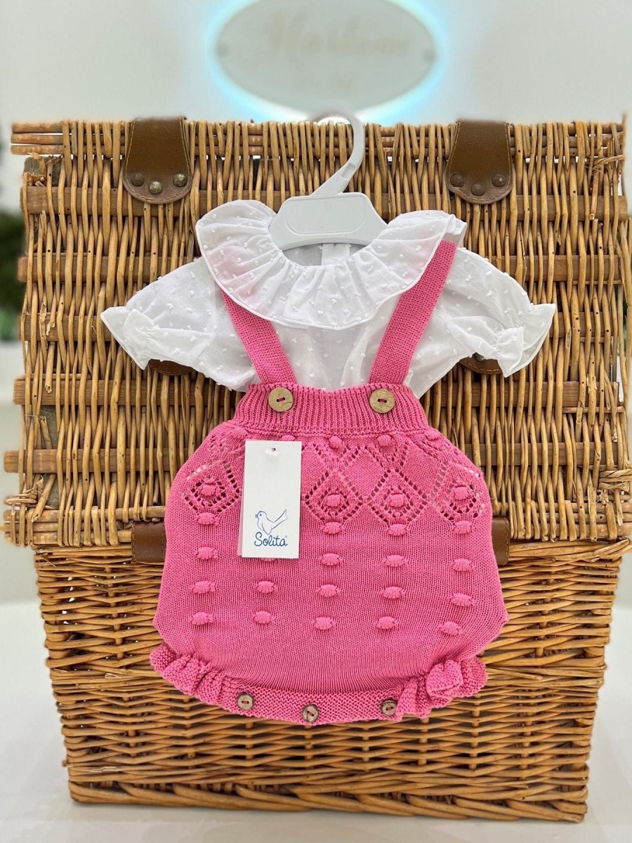 Completo neonata due pezzi composto da pagliaccetto con bretelle in filo di cotone, con trama ricamata e trafori e camicia con rouches e manica corta in plumetis.