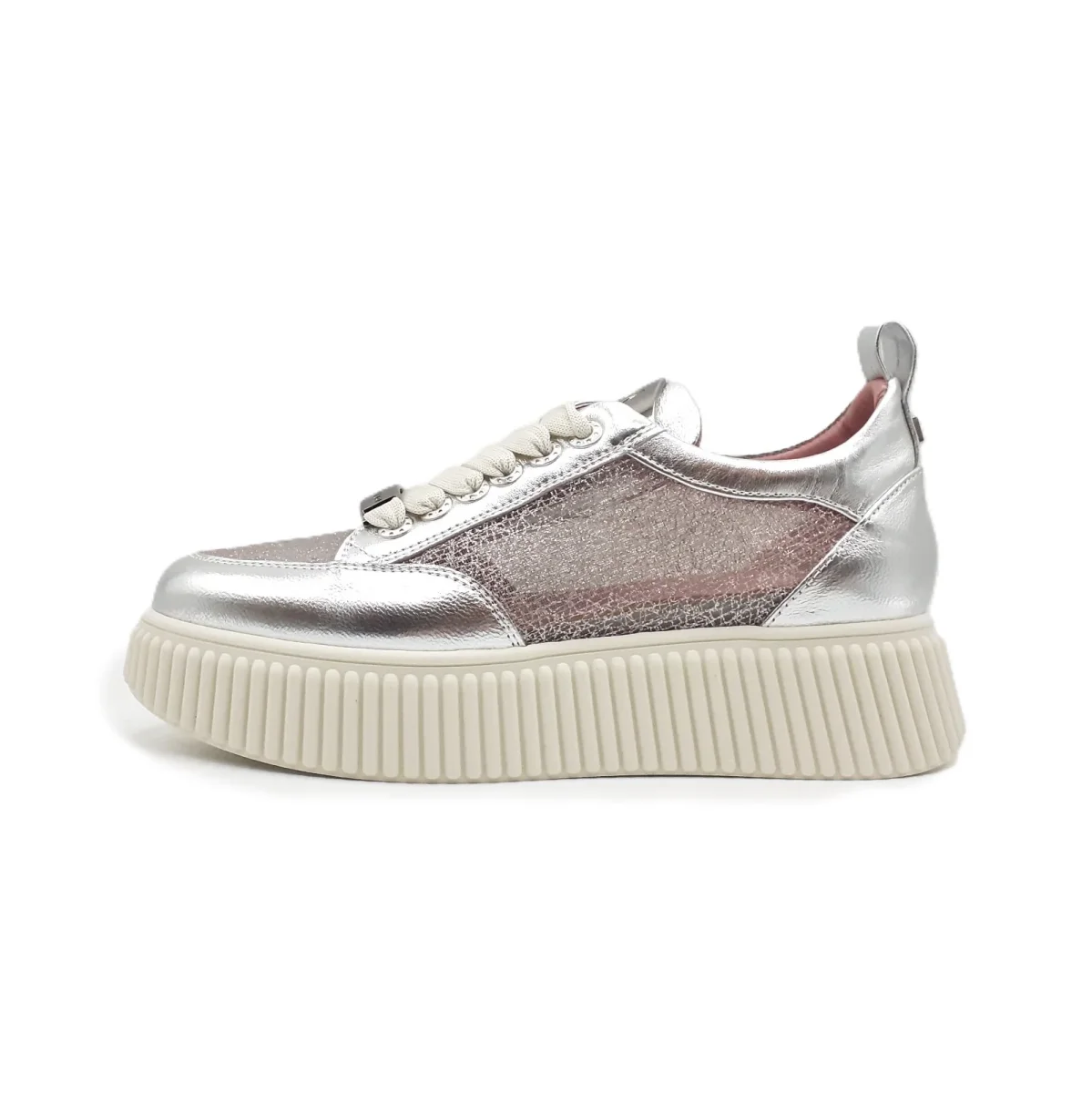 Realizzata in pelle laminata color argento con inserti in tessuto lavorato tono su tono, dona luce all’outfit mantenendo uno stile raffinato e versatile. Il platform di 4 cm slancia la silhouette con naturalezza, garantendo stabilità per l’uso quotidiano.
