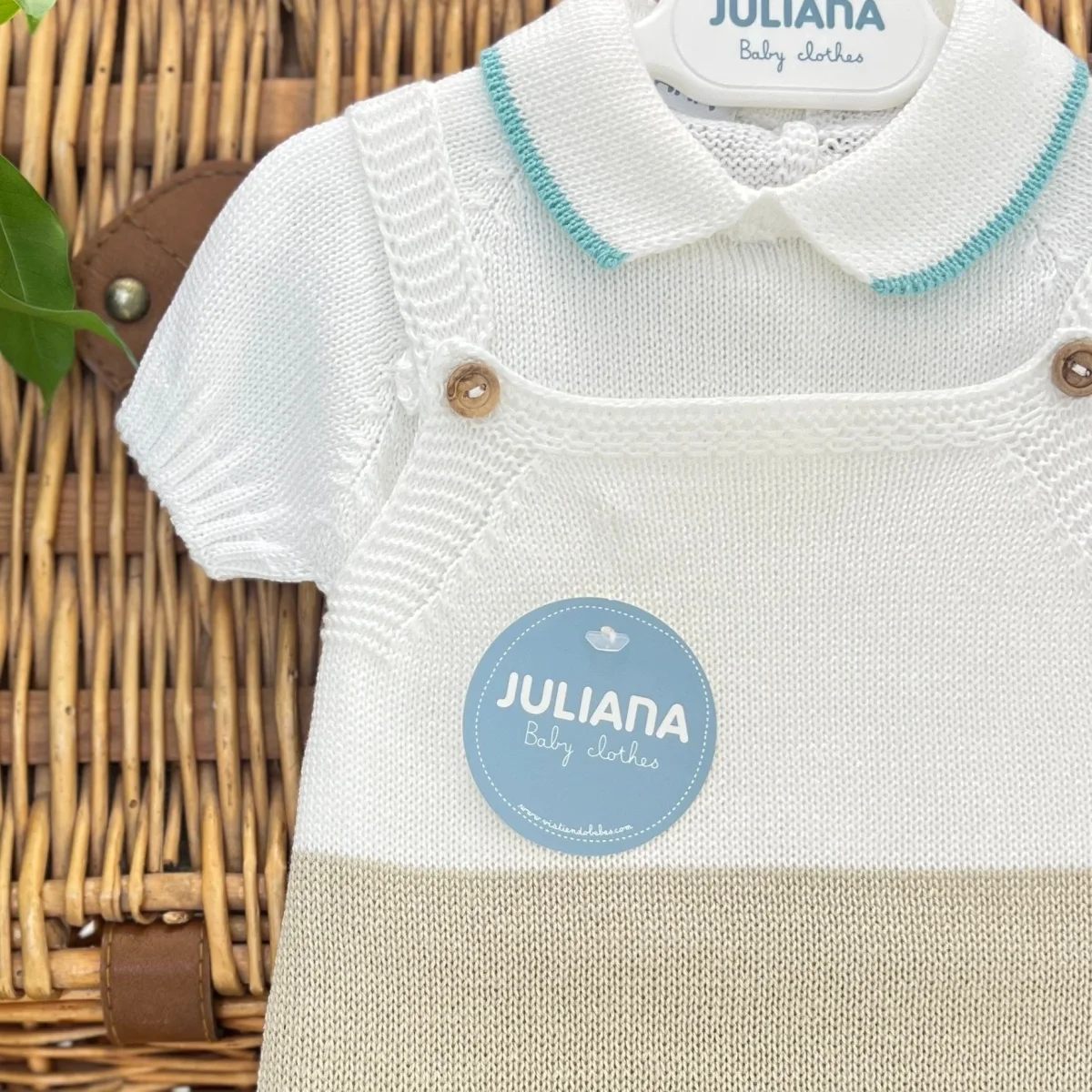 Completo in filo di cotone per neonato composto da salopette corta a righe e maglia manica corta con colletto abbinata.