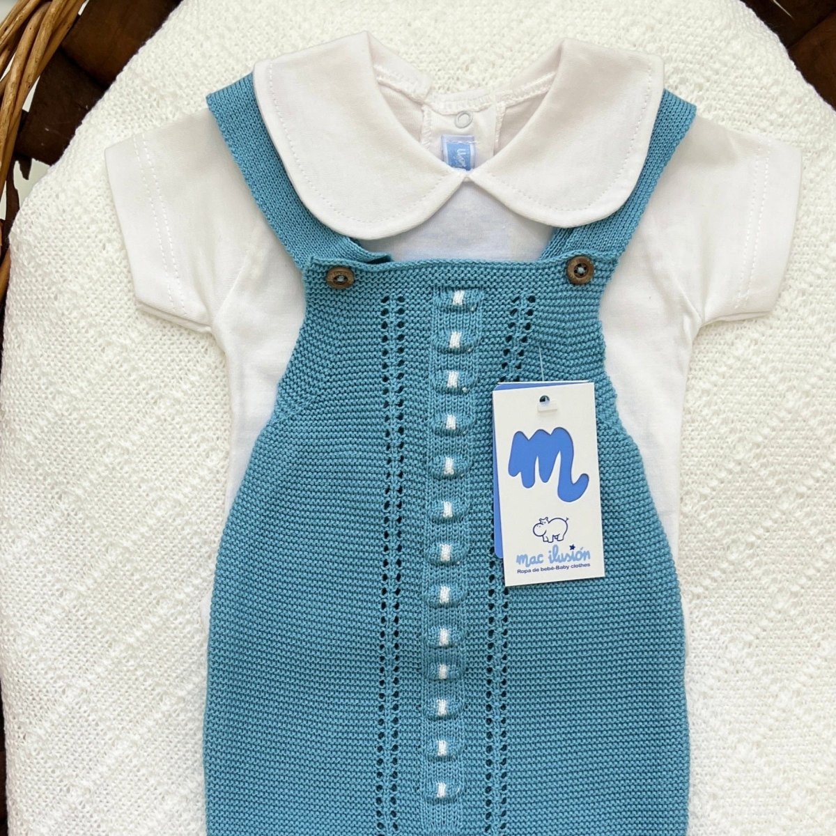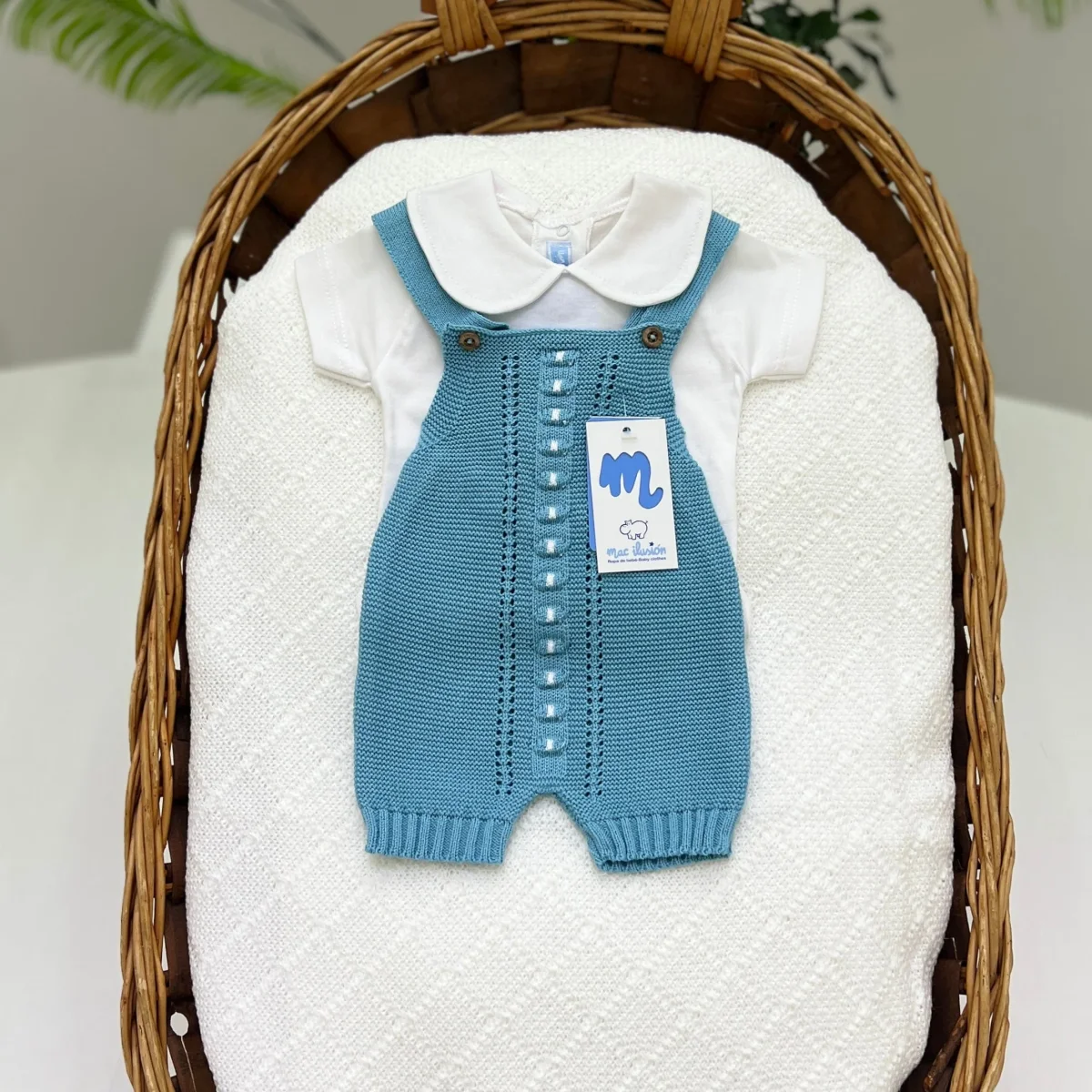Salopette pagliaccetto in filo di cotone con delicati trafori, abbinata t-shirt in cotone jersey con colletto. Leggera e raffinata, ideale per un tocco di eleganza nelle occasioni speciali.