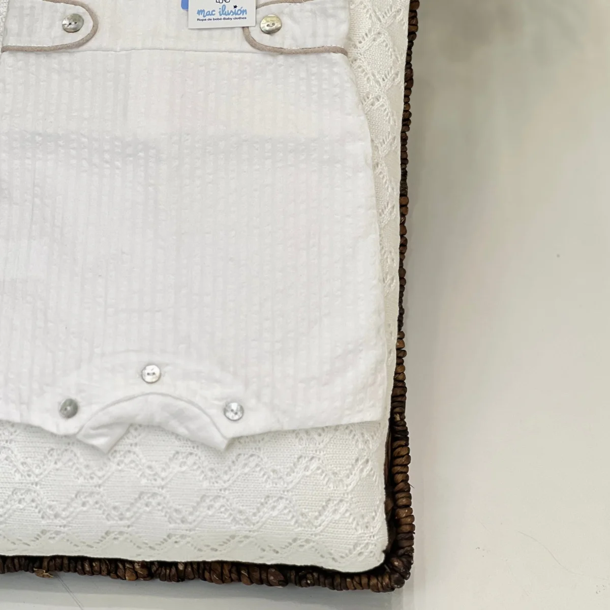 Salopette in cotone per neonato, fresca e comoda, in elegante total white con bordi beige e bottoncini in madreperla. Un capo semplice e raffinato, ideale per garantire comfort e stile al tuo piccolo in ogni occasione