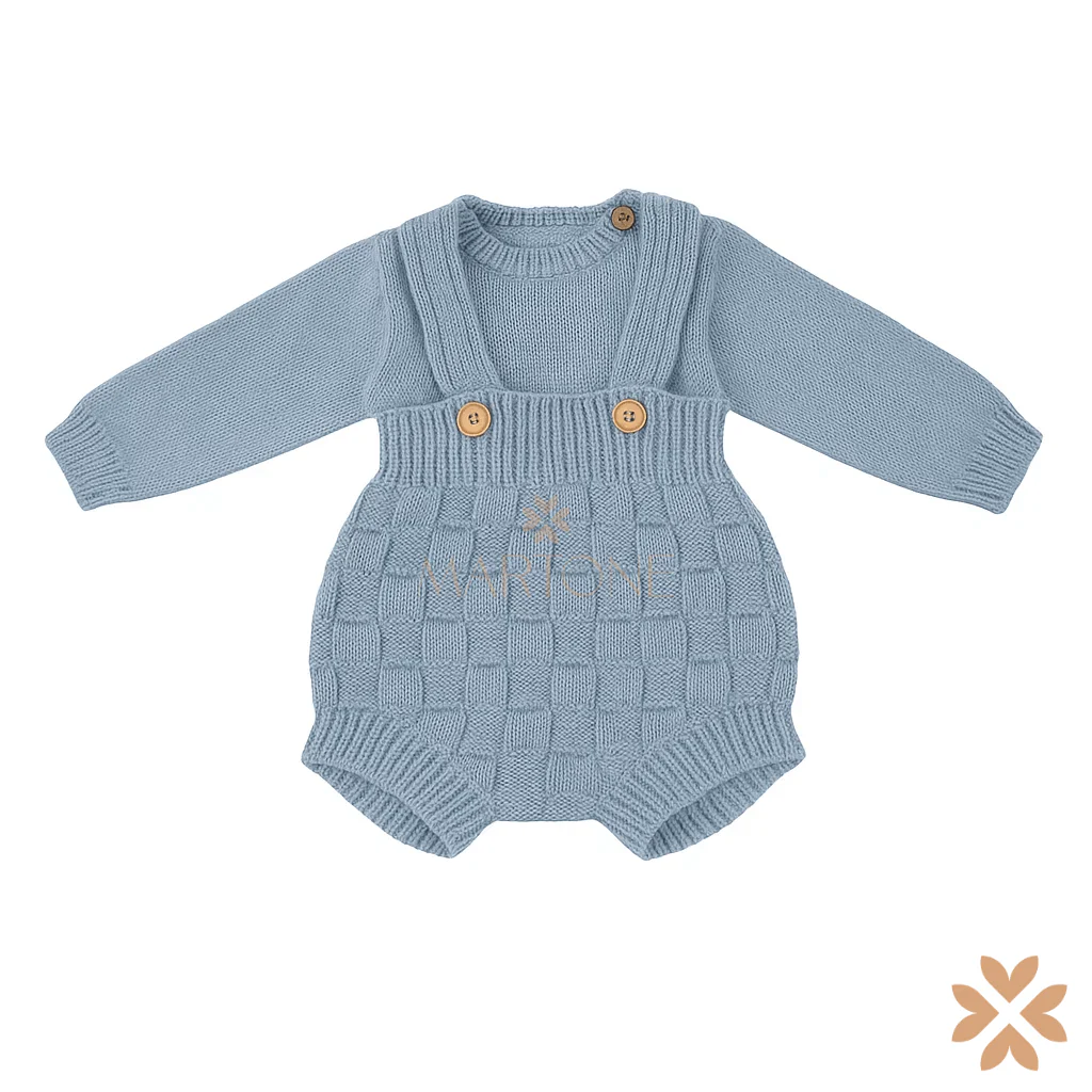 Completo due pezzi in maglia composto da maglia a maniche lunghe con bottoncini sulla spalla e salopette a bretelline con lavorazione a scacchi e bottoni laterali.