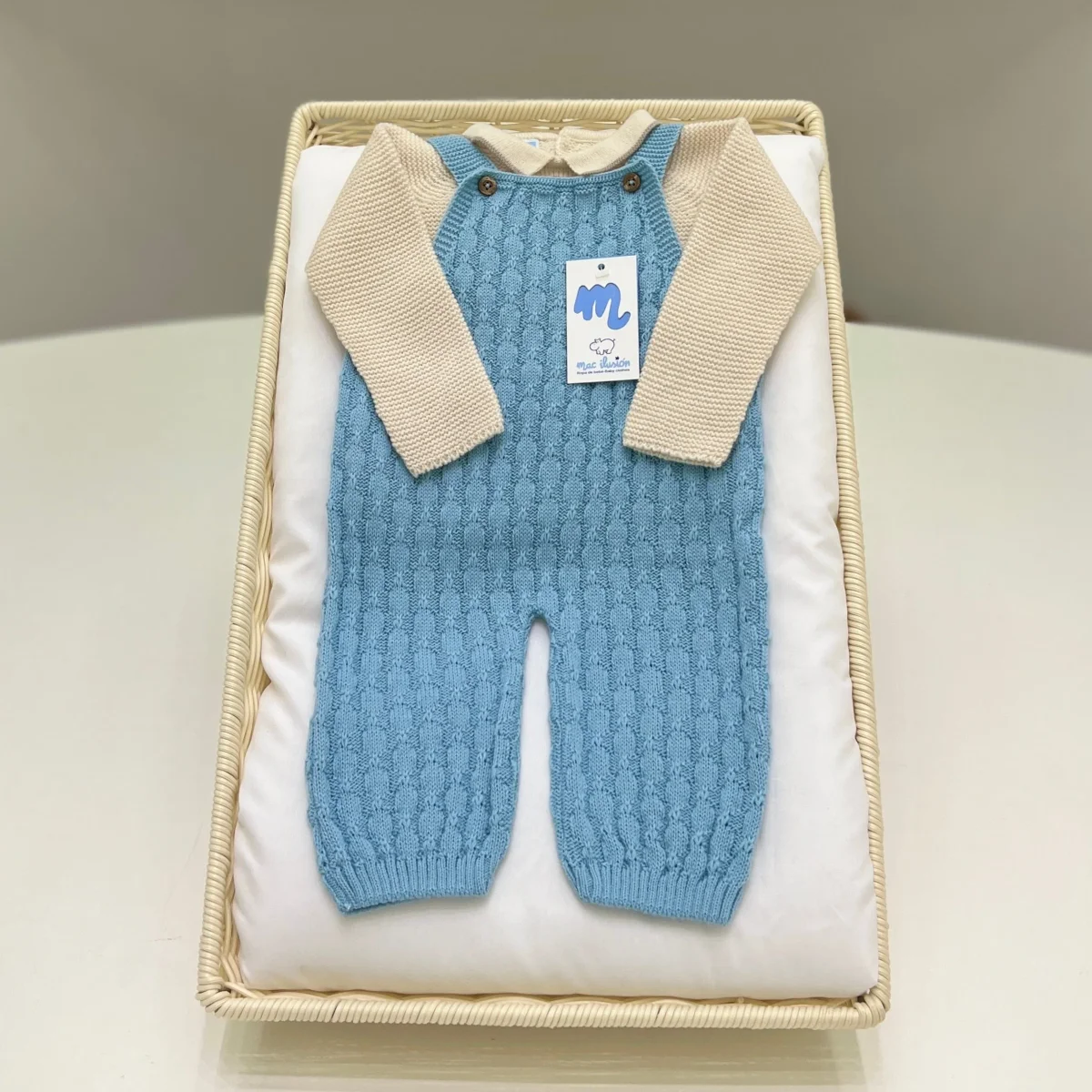 Completo due pezzi salopette in misto lana con maglia coordinata con colletto e bottoncini.