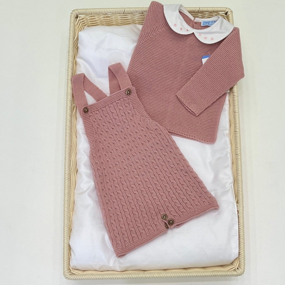 Salopette in misto lana a trecce, con maglia coordinata con colletto.