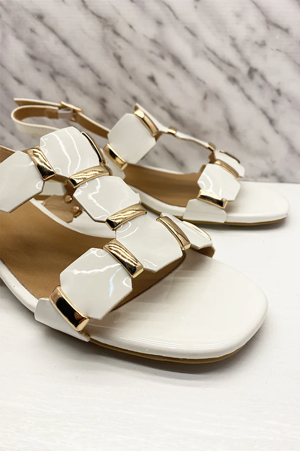 Sandali bassi in eco pelle solid color con disegno geometrico e dettagli metallici, fibbia di regolazione alla caviglia, suola in pelle, tacco basso con fondo in gomma