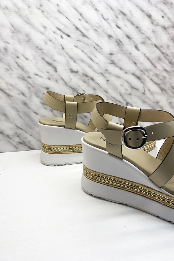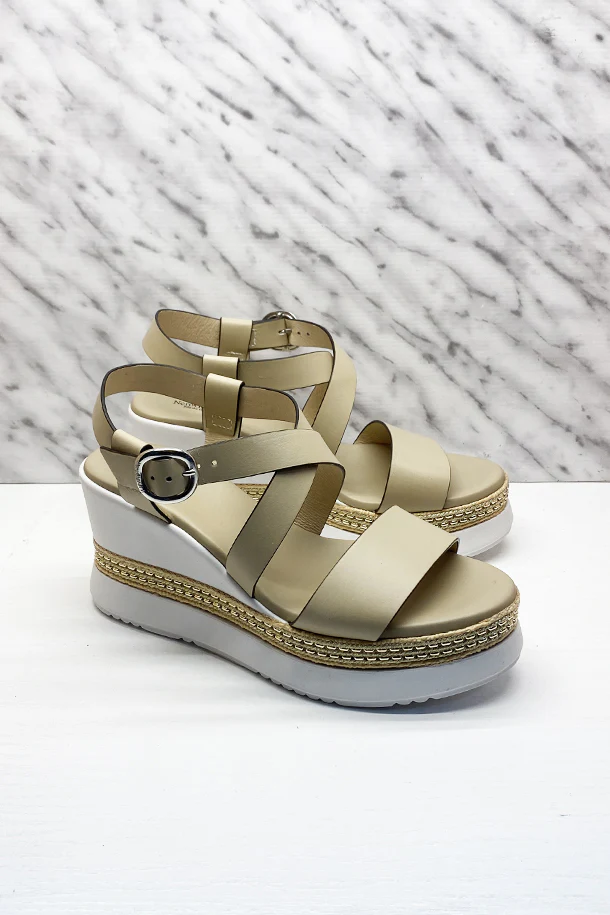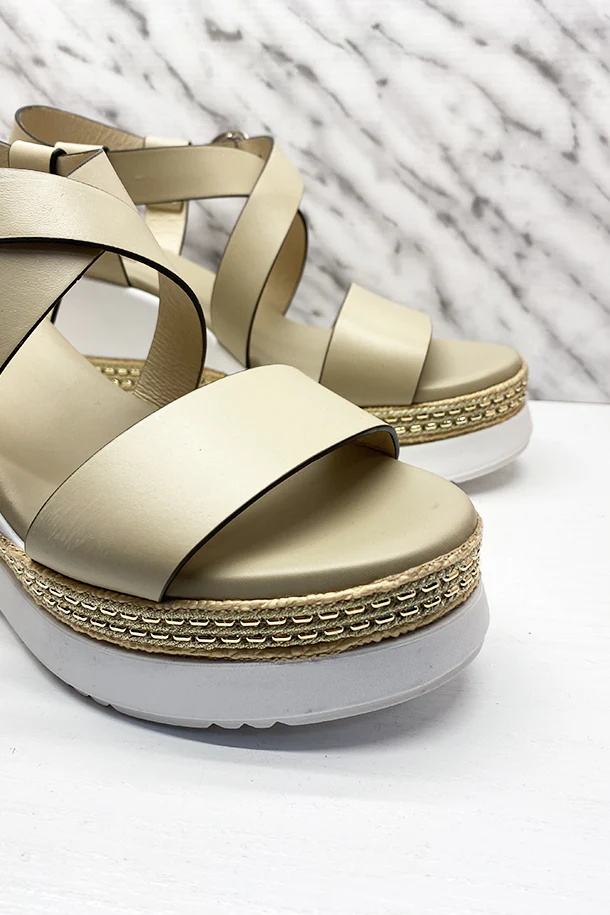 Sandali a fasce avvolgenti in pelle solid color con fibbia di regolazione alla caviglia, suola logata in pelle, zeppa 70mm in gomma con intarsio
