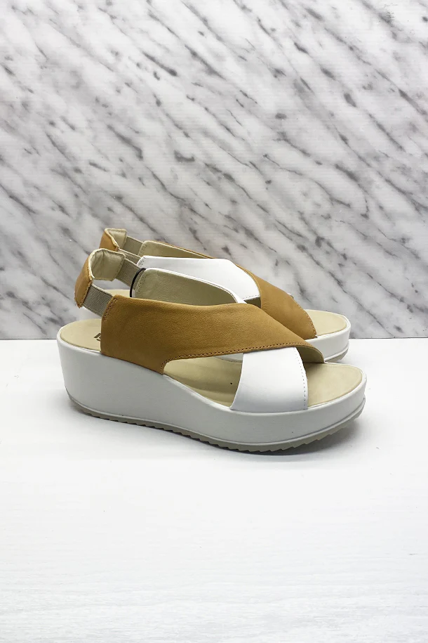 Sandali in pelle a fasce intrecciate con regolazione a strappo, suola in pelle, zeppa 40mm in gomma