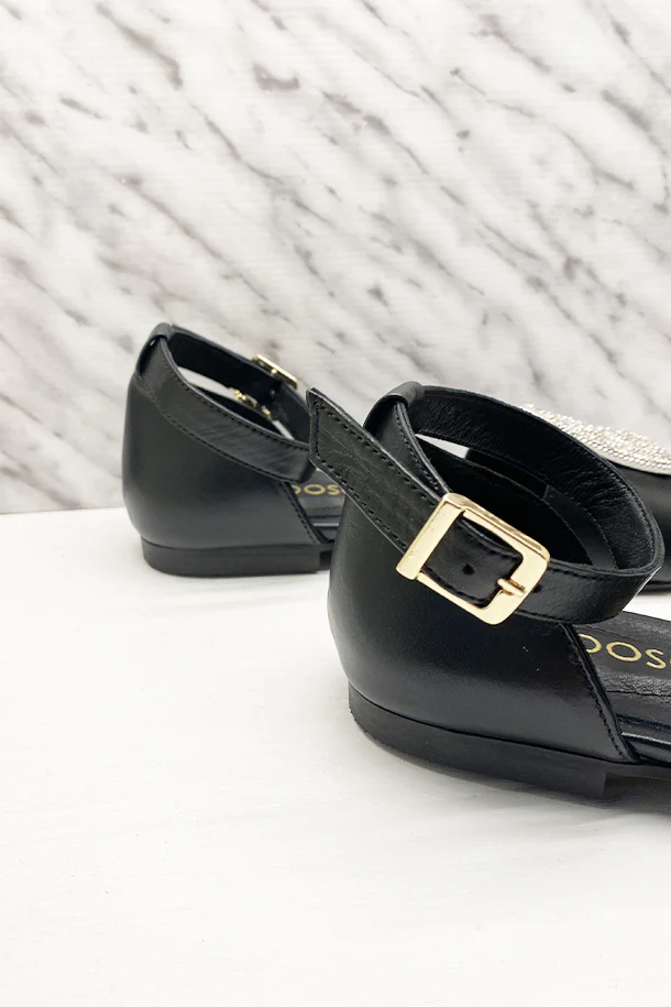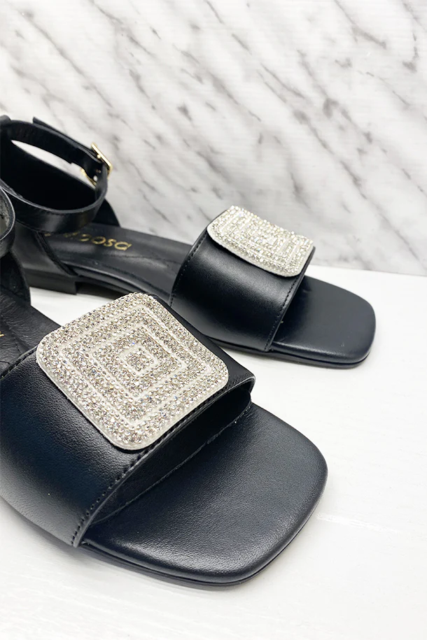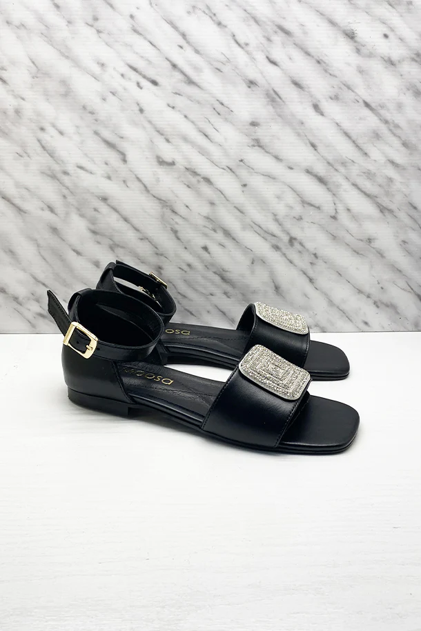 Sandali bassi in pelle solid color con tallone chiuso, fascia frontale con patch brillante, fibbia di regolazione alla caviglia, suola logata in pelle con inserto memory, fondo flat in gomma