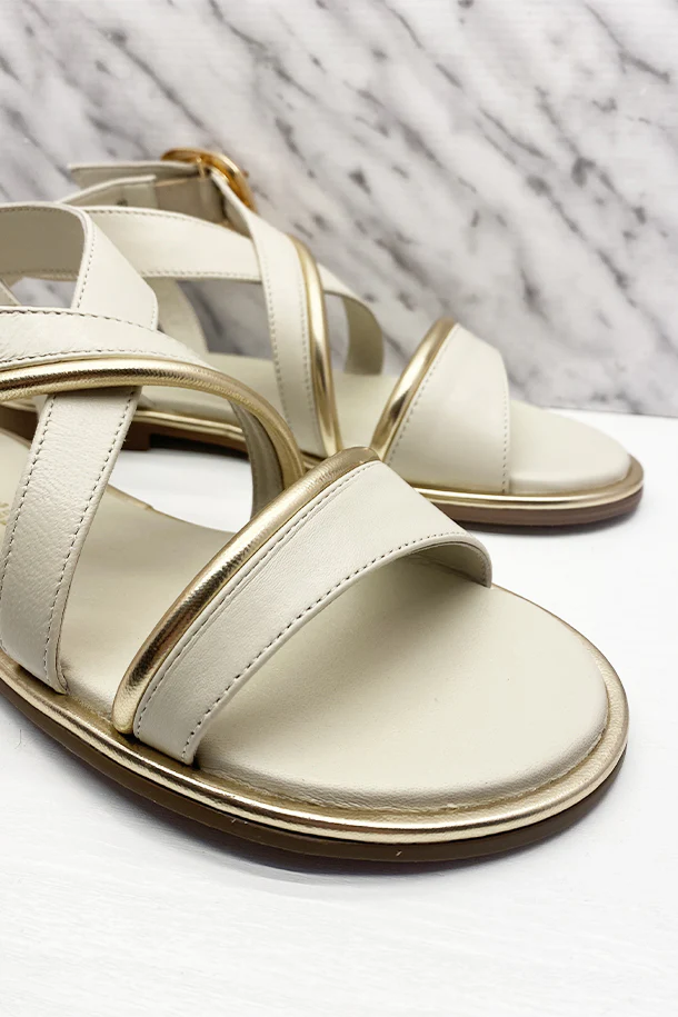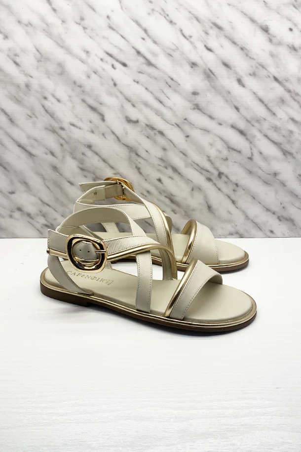 Sandali bassi in pelle solid color con fasce avvolgenti, dettagli laminati, maxi fibbia di regolazione alla caviglia, suola in pelle, fondo flat in gomma