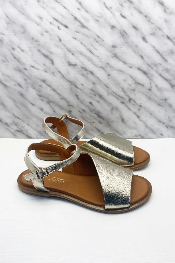 Sandali bassi in pelle laminata con fascia frontale asimmetrica e fibbia di regolazione alla caviglia, suola in pelle con logo, fondo in gomma