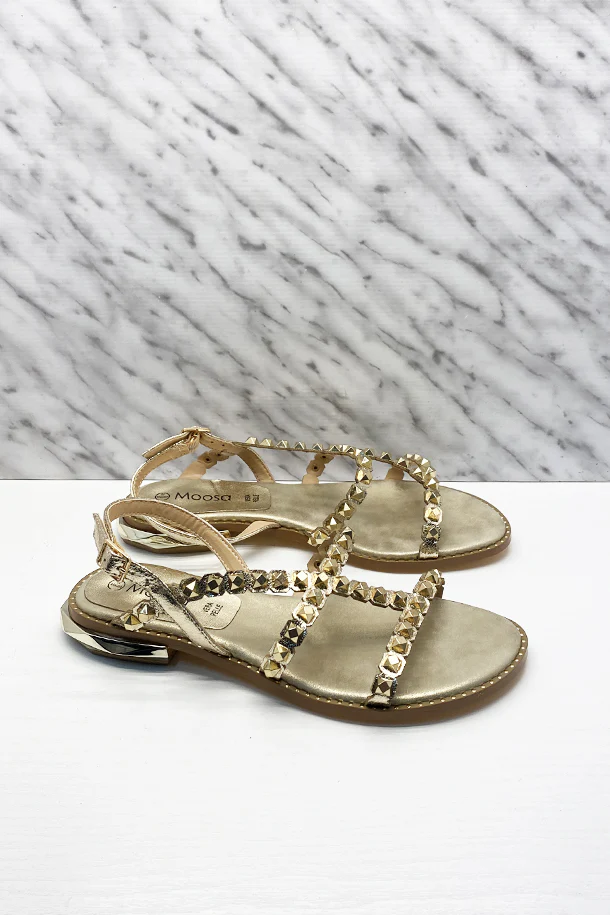 Sandali bassi in eco pelle laminata con borchie metalliche, fibbia di regolazione alla caviglia, suola imbottita con inserto logato in pelle, fondo borchiato in gomma con inserto a specchio
