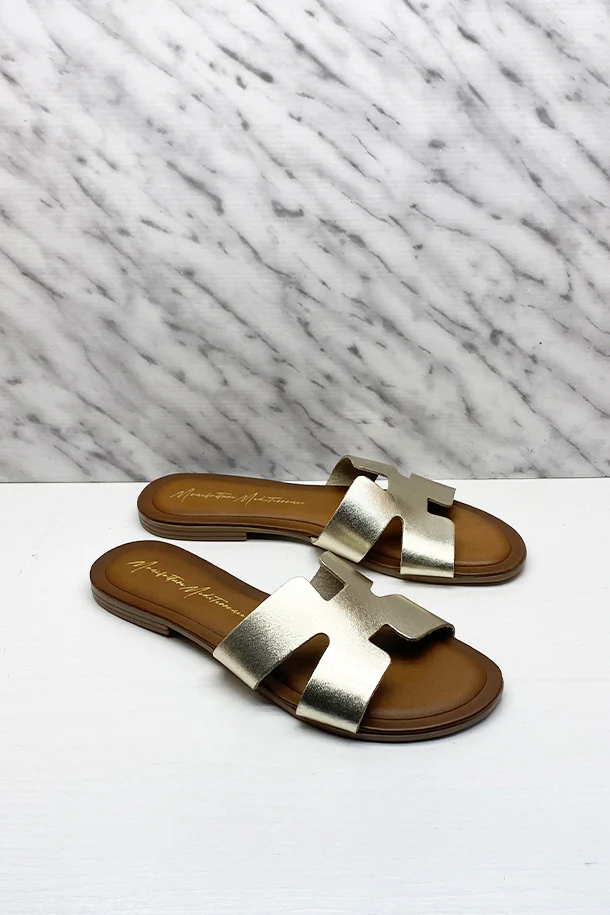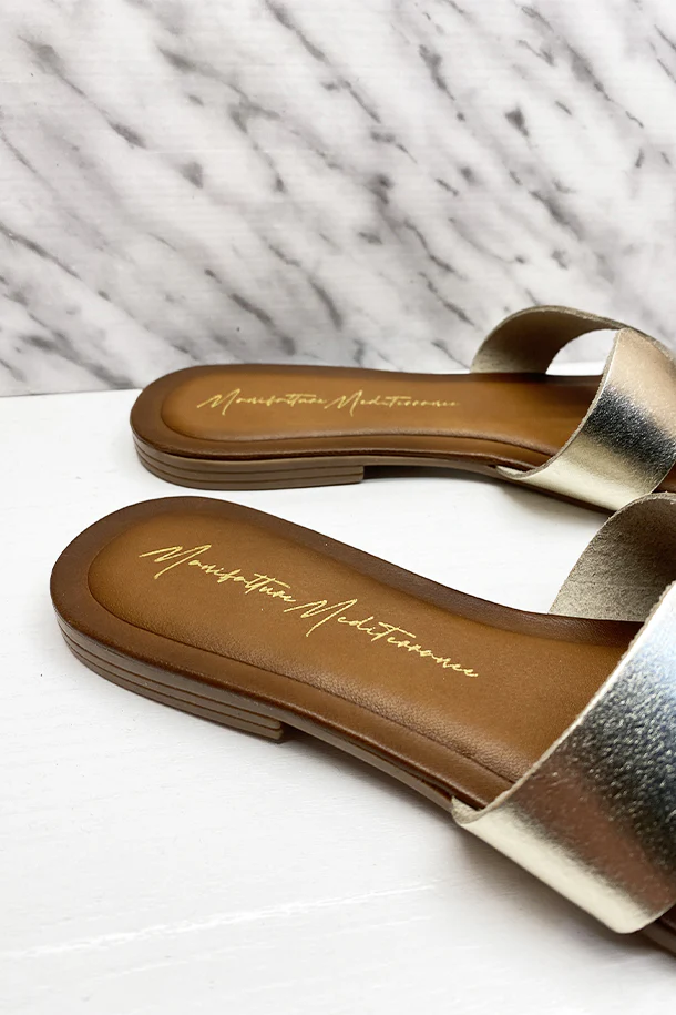 Sandali bassi mono fascia in pelle solid color, sagomatura geometrica, suola logata in pelle, fondo flat in gomma