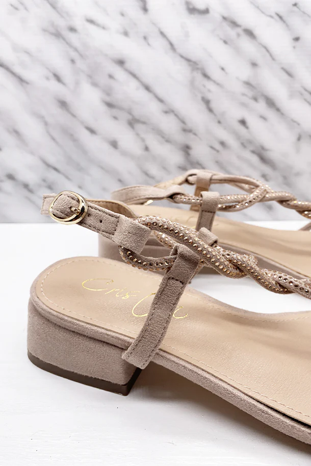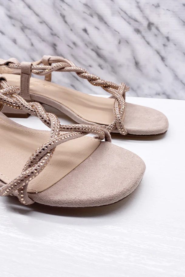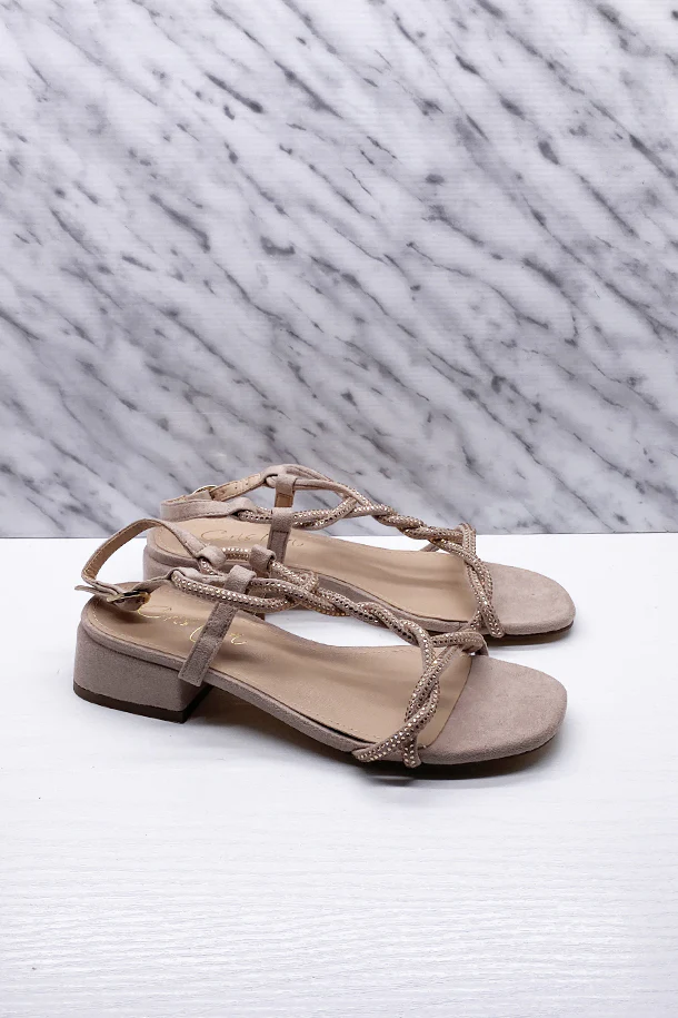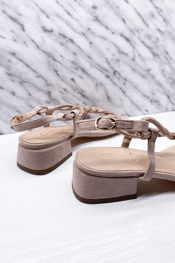 Sandali in eco scamosciato con fasce intrecciate rivestita di strass brillanti, fibbia di regolazione alla caviglia, tacco 20 mm in tinta con fondo e suola in gomma