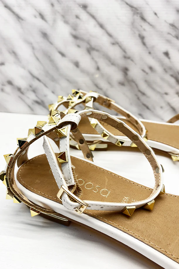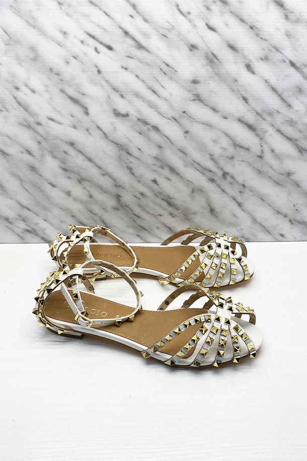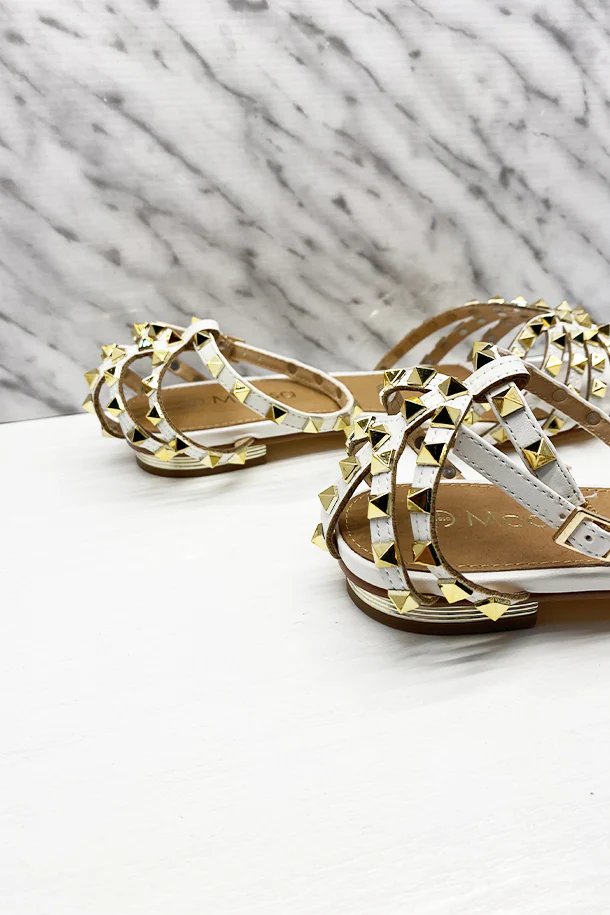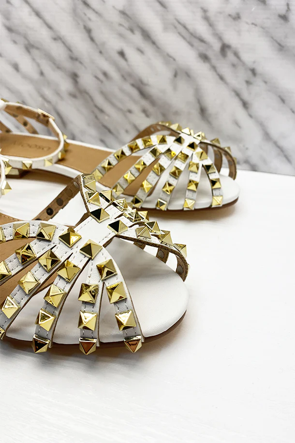 Sandali bassi in eco pelle design a gabbietta rivestita di borchie metalliche, fibbia di regolazione alla caviglia, suola interna in pelle, fondo in gomma con inserto a specchio